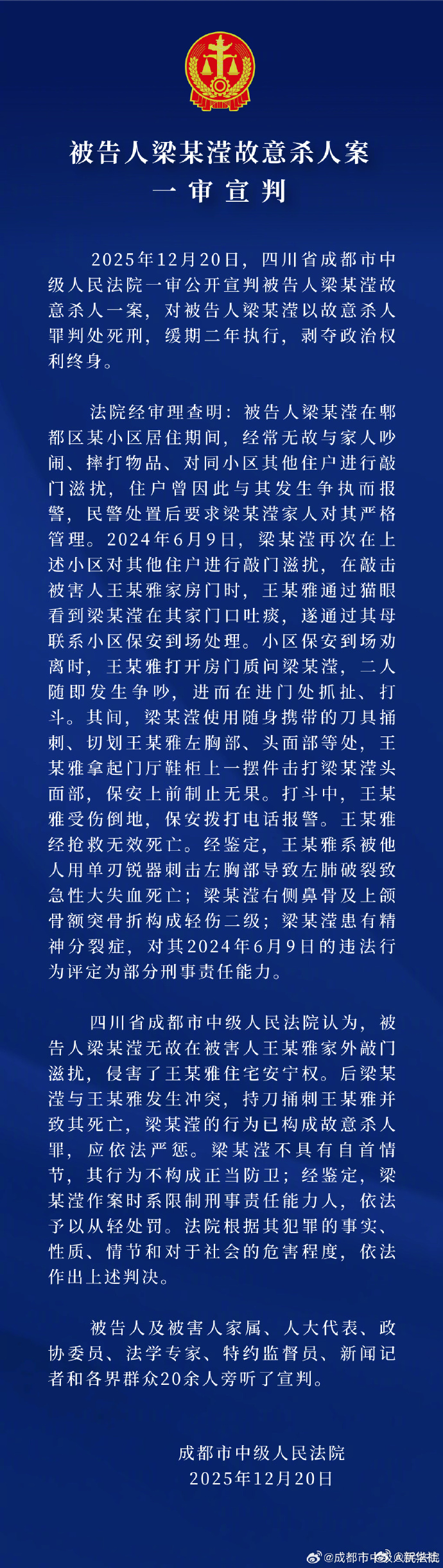#成都女子家门口遇害案被告一审死缓##梁某滢一审被判死缓#【“成都女子家门口遇害案”一审判处被告人死刑 缓期二年执行】2025年12月20日,四川省成都市中级人民法院一审公开宣判被告人梁某滢故意杀人一案,对被告人梁某滢以故意杀人罪判处死刑,缓期二年执行,剥夺政治权利终身。法院经审理查明:被告人梁某滢在成都市郫都区某小区居住期间,经常无故与家人吵闹、摔打物品、对同小区其他住户进行敲门滋扰,住户曾因此与其发生争执而报警,民警处置后要求梁某滢家人对其严格管理。2024年6月9日,梁某滢再次在上述小区对其他住户进行敲门滋扰,在敲击被害人王某雅家房门时,王某雅通过“猫眼”看到梁某滢在其家门口吐痰,遂通过其母联系小区保安到场处理。小区保安到场劝离时,王某雅打开房门质问梁某滢,二人随即发生争吵,进而在进门处抓扯、打斗。其间,梁某滢使用随身携带的刀具捅刺、切划王某雅左胸部、头面部等处,王某雅拿起门厅鞋柜上一中空摆件击打梁某滢头面部,保安上前制止无果。打斗中,王某雅受伤倒地,保安拨打电话报警,王某雅经抢救无效死亡。经鉴定,王某雅系被他人用单刃锐器刺击左胸部导致左肺破裂致急性大失血死亡;梁某滢右侧鼻骨及上颌骨额突骨折构成轻伤二级;梁某滢患有精神分裂症,对其2024年6月9日的违法行为评定为部分刑事责任能力。四川省成都市中级人民法院认为,被告人梁某滢无故在被害人王某雅家外敲门滋扰,侵害了王某雅住宅安宁权。后梁某滢与王某雅发生冲突,持刀捅刺王某雅并致其死亡,梁某滢的行为已构成故意杀人罪,应依法严惩。梁某滢不具有自首情节,其行为不构成正当防卫;经鉴定,梁某滢作案时系限制刑事责任能力人,依法予以从轻处罚。法院根据其犯罪的事实、性质、情节和对于社会的危害程度,依法作出上述判决。被告人及被害人家属、人大代表、政协委员、法学专家、特约监督员、新闻记者和各界群众20余人旁听了宣判。(新华社,图片来源:成都市中级人民法院)