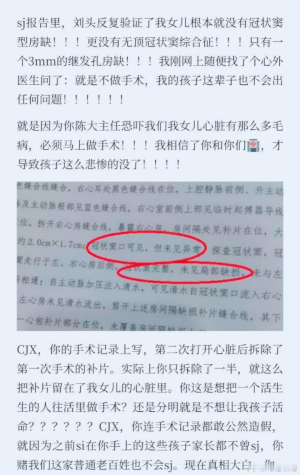 1.术前诊断的7mm房缺去哪了?冠状窦型房缺的依据在哪?2.创口不缝合,补片留一半,这到底是治疗还是草菅人命?小洛熙的尸检报告,撕开了过度医疗的遮羞布!每一个冰冷的医学术语背后,都是一个家庭破碎的哭声。韩红为小洛熙宝宝发声希望更多的人士出来为小洛熙 发声,希望有关部门严查,把这些害群之马绳之以法,还普通民众朗朗乾坤。