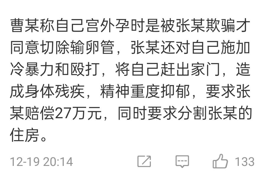 四川这起闪婚悲剧,看得人五味杂陈!认识1个月就领证,8万8千彩礼敲定的婚姻,却在两年后变成一地鸡毛——曹女士因宫外孕切除输卵管,术后没几天,丈夫张某不仅动手打人、换锁赶她出门,还两次起诉离婚。 更让人心疼的是,被赶出家门的曹女士确诊重度抑郁,她控诉丈夫欺骗自己切除输卵管、长期冷暴力,索赔27万却被法院驳回。法院认为输卵管切除是正常就医结果,最终只判张某补偿3万4千6百,并准许离婚。 短短两年婚姻,从闪婚的冲动到宫外孕的变故,再到暴力与驱逐,到底是谁错了?是闪婚太草率,还是人心经不起考验?网友吵翻了:有人为曹女士鸣不平,觉得补偿太少;也有人说婚姻本就该谨慎。 你怎么看这场闹剧?闪婚到底靠谱吗?评论区聊聊,给身心受创的曹女士点个赞,转发让更多人思考婚姻里的责任与温度~