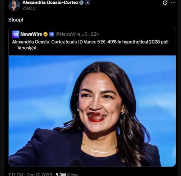 【万斯的 “噩梦”?AOC 正面回应 2028 大选对决】美国民主党众议员亚历山德里娅・奥卡西奥 - 科尔特斯(AOC)12 月 17 日就 2028 年总统大选相关民调表态,称若与共和党热门人选万斯对决,自己会 “碾压” 对方。此前她分享的民调显示,两人在假设竞选中以 51% 对 49% 微弱差距持平,处于误差范围内。 面对记者提问,AOC 先淡化提前三年民调的参考价值,随后笑着强调 “会碾压他”,并直言分享民调是因 “万斯就是个傻瓜”。万斯此前曾将 AOC 当选总统形容为 “噩梦”,称 “一想到 AOC 总统就睡不着觉”。 目前民主党初选呈混战态势,哈里斯、纽森暂时领先,AOC 凭借鲜明左翼立场和网络影响力跻身热门人选。而万斯获特朗普明确支持,被视为共和党 2028 年领跑者,唯一潜在对手鲁比奥已表态若万斯参选将退出。此外,外界也猜测 AOC 或转而挑战纽约州参议员席位,而非直接竞选总统。 这场隔空交锋看似玩笑,实则提前揭开 2028 年美国大选的博弈序幕。AOC 的强硬回应既呼应了万斯此前的 “噩梦” 言论,也借民调热度巩固自身支持者基础。当前两党潜在候选人格局初显,特朗普对万斯的背书与 AOC 的草根号召力形成鲜明对比。不过,距离大选尚有三年,民调数据参考意义有限,后续候选人是否正式参选、政策主张如何博弈,才是决定选举走向的关键。