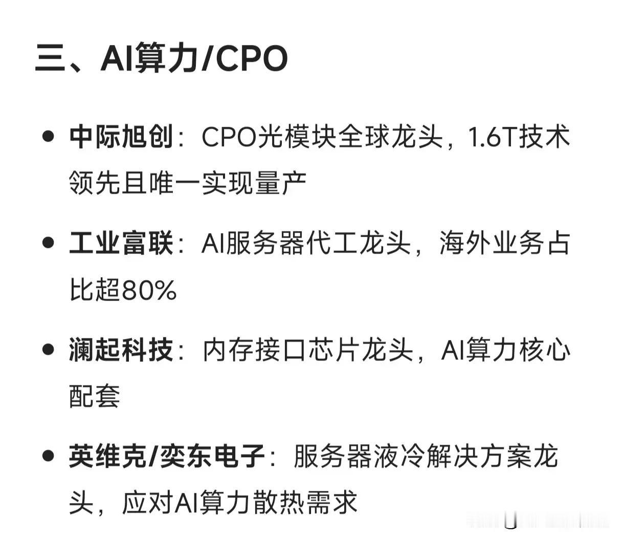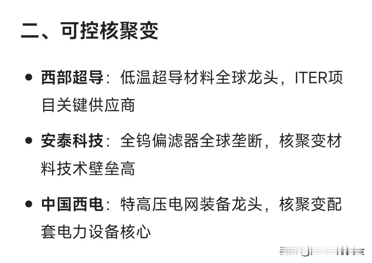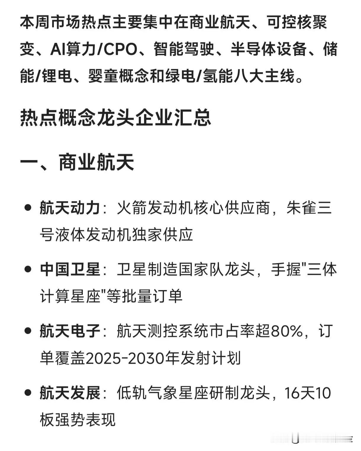 本周市场热点汇总: 主要集中在商业航天、可控核聚变、AI算力/CPO、智能驾驶、半导体设备、储能/锂电、婴童概念和绿电/氢能八大主线。 热点概念龙头企业汇总 一、商业航天 航天动力:火箭发动机核心供应商,朱雀三号液体发动机独家供应 中国卫星:卫星制造国家队龙头,手握"三体计算星座"等批量订单 航天电子:航天测控系统市占率超80%,订单覆盖2025-2030年发射计划 航天发展:低轨气象星座研制龙头,16天10板强势表现 二、可控核聚变 西部超导:低温超导材料全球龙头,ITER项目关键供应商 安泰科技:全钨偏滤器全球垄断,核聚变材料技术壁垒高 中国西电:特高压电网装备龙头,核聚变配套电力设备核心 三、AI算力/CPO 中际旭创:CPO光模块全球龙头,1.6T技术领先且唯一实现量产 工业富联:AI服务器代工龙头,海外业务占比超80% 澜起科技:内存接口芯片龙头,AI算力核心配套 英维克/奕东电子:服务器液冷解决方案龙头,应对AI算力散热需求 四、智能驾驶 浙江世宝:L3级自动驾驶转向系统龙头,首批获准企业 德赛西威:智能座舱渗透率提升,高阶智驾方案量产 北汽蓝谷:极狐牌BJ7001A61NBEV获L3级自动驾驶准入 五、半导体设备 中芯国际:晶圆代工龙头,成熟制程产能满载 北方华创:半导体设备龙头,刻蚀薄膜沉积设备全覆盖 张江高科:光刻机概念核心,参股光刻机核心企业 长电科技:封测龙头企业,先进封装技术领先 六、储能/锂电 盛新锂能:碳酸锂涨价核心受益龙头,磷酸铁锂补能效率提升 宁德时代:动力电池龙头,储能电池订单占比达30% 阳光电源:储能逆变器龙头,订单排至明年Q1 七、婴童概念 孩子王:三胎概念龙头,国家医保局力争2026年实现生娃基本不花钱 南京新百:养老概念龙头,受益于生育补贴政策 贝因美:婴童食品龙头,核心标的之一 八、绿电/氢能 雪人集团:氢能龙头,培育氢能、绿色燃料等新增长点 中国天楹:绿电核心标的,建设零碳园区、零碳工厂 华光环能:氢能全产业链布局,政策支持明确