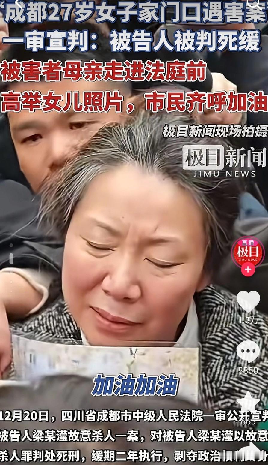 成都女子家门口遇害一案,到底算是输了还是赢了?当“死刑,缓期二年执行”的判决落地,被害人母亲的崩溃与网友的热议交织,这场承载着公众正义期待的审判,到底该如何定义? 但本案中,即便梁某滢被司法鉴定为“患有精神分裂症,系限制刑事责任能力人”,法院仍未放弃对其罪责的追究,打破了“精神病=免责”的误区,这无疑是司法进步的体现。 但是这场“死缓两年”的判决,意味着梁某滢还有出狱的可能,只要在缓刑考验期内没有故意犯罪,两年后便会依法减为无期徒刑,后续甚至可能因减刑、假释获得自由,这就是受害者母亲无法接受的事实。 这场判决到底是“赢”还是“输”,或许没有绝对答案。它赢在打破了“精神病脱罪”的怪圈,让司法正义不再缺位。赢在让公众看到,即便有精神异常的认定,严重暴力犯罪也终将受到法律的严惩。 但它也输在了受害者家属的情感期待里,输在了“杀人偿命”的朴素认知中,输在了那个27岁女孩再也无法归来的遗憾里。 (图片来自网络视频)