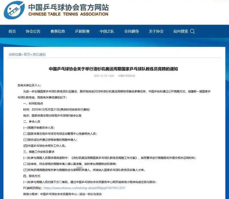 国乒今天启动改革,樊振东的奥运策略非常简单! 今天,中国乒协在官网发布教练员竞聘通知。随着这一通知的发布,国乒教练组启动改革,同时也正式开启了2028年洛杉矶奥运会的备战工作。 根据通知,国乒教练组将有总教练、副总教练(增设)、男主教练、女主教练等岗位。个人相信这必将带来现有教练组人员的变动,也会包括队员的变动,比如老队员退役、新队员加入等。 奥运的备战工作,核心还是参赛队员,樊振东作为国乒的核心主力,人现在在德国打联赛,暂时没有回到国乒队伍,也没有参加国际比赛,更没有世界排名。 那么,在这种情况下,如果樊振东想参加2028年洛杉矶奥运会,策略会是什么呢?个人觉得最简单也是最有效的,就是保持极高甚至全世界最高的竞技水平。 只要樊振东能够保持全世界最高的竞技水平,那么他参加2028年奥运会就不会有任何问题,不要小看国家“奥运战略”这四个字的份量,这可是国家层面的大事。 只要你水平足够强,你不想参加奥运会,恐怕都不行,因为一枚奥运金牌不仅仅是一枚金牌,背后还连带着很多人的荣誉、名利、政绩和升迁,在这些连带面前,任何阻碍都会有人帮你解决掉。 前段时间,WTT香港总决赛时,国际乒联主席索林已经对樊振东参加2028年奥运会释放了善意。接下来,随着国乒教练员竞聘的结束,该是国内有关方面对樊振东抛出橄榄枝了。 竞技体育,胜者为王,实力决定一切,樊振东只要保持最高的竞技水平和状态,参加2028年奥运会,只要他想,自有人为他解决一切!
