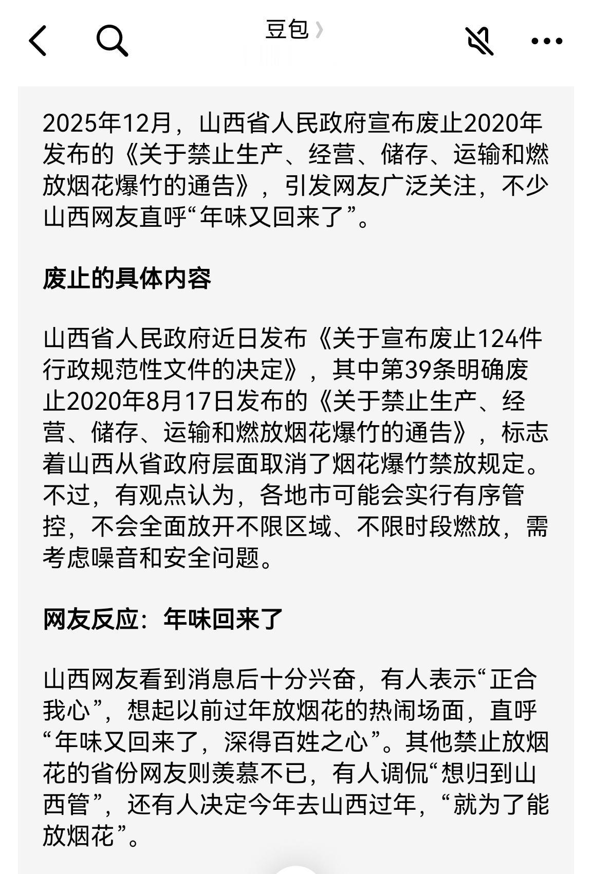 山西12月16日取消了烟花爆竹禁放规定,迎来了全网一片称赞。 山西网友忍不住在惊呼:年味回来了!! 外省网友纷纷送上羡慕的祝福。 可以说山西省此举是真正为百姓办了一件实事,无数山西网友都表示:今年终于能过一个“有声有色”的大年三十了。 热闹团圆是过年的底色,恭喜山西今年要过一个热闹的新年。