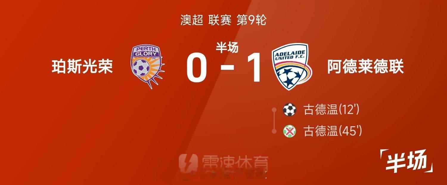 每日足球推荐 25/26赛季澳超联赛第9轮,珀斯光荣迎战阿德莱德联。半场战罢,双方比分暂为珀斯光荣0-1阿德莱德联,古德温破门建功,古德温失点。