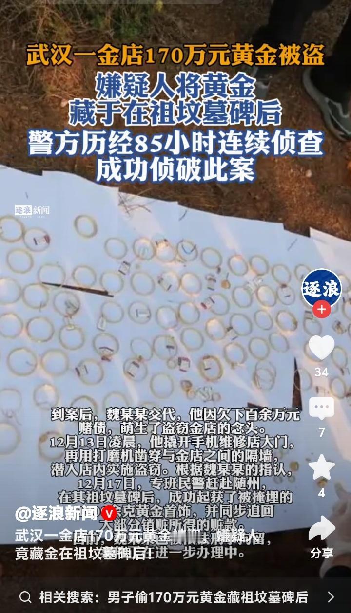 武汉惊天窃案!赌徒为还百万赌债深夜凿穿金店墙壁,竟将价值170万黄金藏匿于随州老家祖坟墓碑后! 当珠宝店店长助理推开店门,眼前的景象让他瞬间血液凝固。右侧墙壁赫然破开一个大洞,店内柜台狼藉一片,六个黄金首饰柜台已被洗劫一空。这是2023年12月13日清晨,发生在武汉黄陂区盘龙城某金店的骇人一幕。经清点,约1783克、价值170万元的黄金不翼而飞。年关将至,如此巨案,瞬间挑动了所有人的神经。 现场勘查更显窃贼的狡猾与猖狂。金店配电箱遭破坏,监控失效。相邻手机维修店门锁被撬,隔墙被专业工具凿穿。窃贼显然经过周密策划,从隔壁店潜入,直击金店软肋。凌晨时分,一个全身包裹严实、头戴头盔口罩、身穿雨衣的身影,如同鬼魅般在此活动了近两小时,未留下任何清晰面容。 案件迷雾重重,但警方侦查的巨网已悄然撒开。市区两级公安机关联动,成立专班。监控海量视频中,民警不眠不休追踪二十余小时,终于捕捉到关键线索——一辆白色轿车。它案发前从随州来,案发后即刻原路返回,司机全程用遮阳板死死挡住面部。这反常的轨迹与举动,让其瞬间成为焦点。 通过高速路网抓拍图像,警方锁定了嫌疑人:有犯罪前科的随州籍男子魏某某。此时,魏某某已逃至咸宁。兵贵神速,抓捕组立即赶赴。12月16日晚,在咸宁通山县,魏某某落网。到案后,他对其罪行供认不讳,而动机竟是为了填补赌博欠下的百余万元巨债。 为实施盗窃,魏某某可谓处心积虑。他多次踩点,购置了头盔、雨衣、手套、电动车、打磨机等全套工具。作案时,他极度谨慎,打磨机每响几分钟就停歇观察,甚至特意骑车到附近派出所外围窥探动静。得手后,他变卖部分黄金还债,而剩余的大量赃物,却被他藏到了一个所有人都意想不到的地方。 当民警根据指认,赶到随州某村魏家祖坟时,一场令人瞠目的挖掘开始了。在亲属和村民震惊的目光中,民警从一块墓碑的后方泥土下,起获了用布包裹的、金光闪闪的1300余克黄金首饰。魏某某竟认为,这片安息先人的肃穆之地,是藏匿不义之财的“风水宝地”。从起贼心到赃物埋入祖坟,其荒唐行径令人咋舌。 这场历时85小时的极速追缉,最终人赃并获。魏某某的“完美计划”连同他的黄金梦,一同埋葬在了自己选择的藏匿点。他原本盘算着尽快出手剩余黄金便逃往境外,却低估了警方破案的决心与效率。天网恢恢,疏而不漏,这场现实版的“黄金大劫案”以其离奇的情节和迅速的告破,给所有人上了一课。 贪婪的欲望让魏某某铤而走险,而他对祖坟的亵渎,更凸显其道德的沦丧与对传统的漠视。此案不仅警示那些游走在法律边缘的人莫伸手,也提醒商家务必加强安防。警方雷霆万钧的破案效率,则再次证明了守护社会安宁的坚定力量。赌债是无底深渊,而踏错一步,便是人生的彻底覆灭。 黄金窃案 赌债深渊