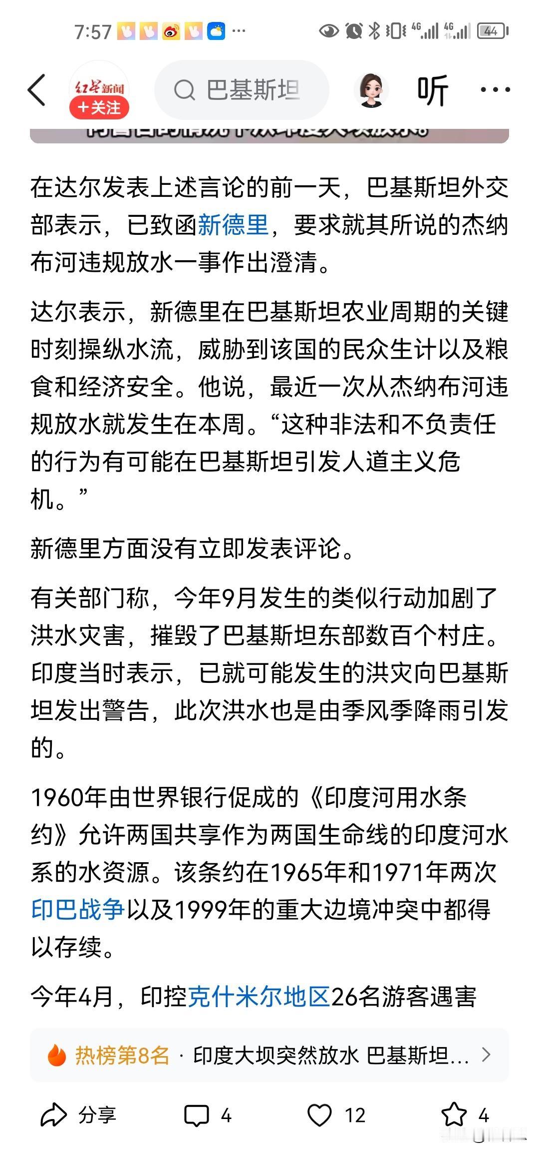 印度又使坏呀,在毫无通知的情况下,向巴基斯坦下游放水,造成巴基斯坦粮食和人员生命重大的损失。印度这个国家道德就是败坏,他们的心肠确实挺毒的,印度和日本的道德观是一大同小异。看来5月份巴基斯坦对印度还是太仁慈了,要打就打服打狠。放虎归山,还是反受其害,毕竟巴基斯坦在下游,印度在上游,如果他真的把水当成武器,巴基斯坦敢还击吗?如果真的反击,可能还有一线生机,要不然时不时放水挺难受的。