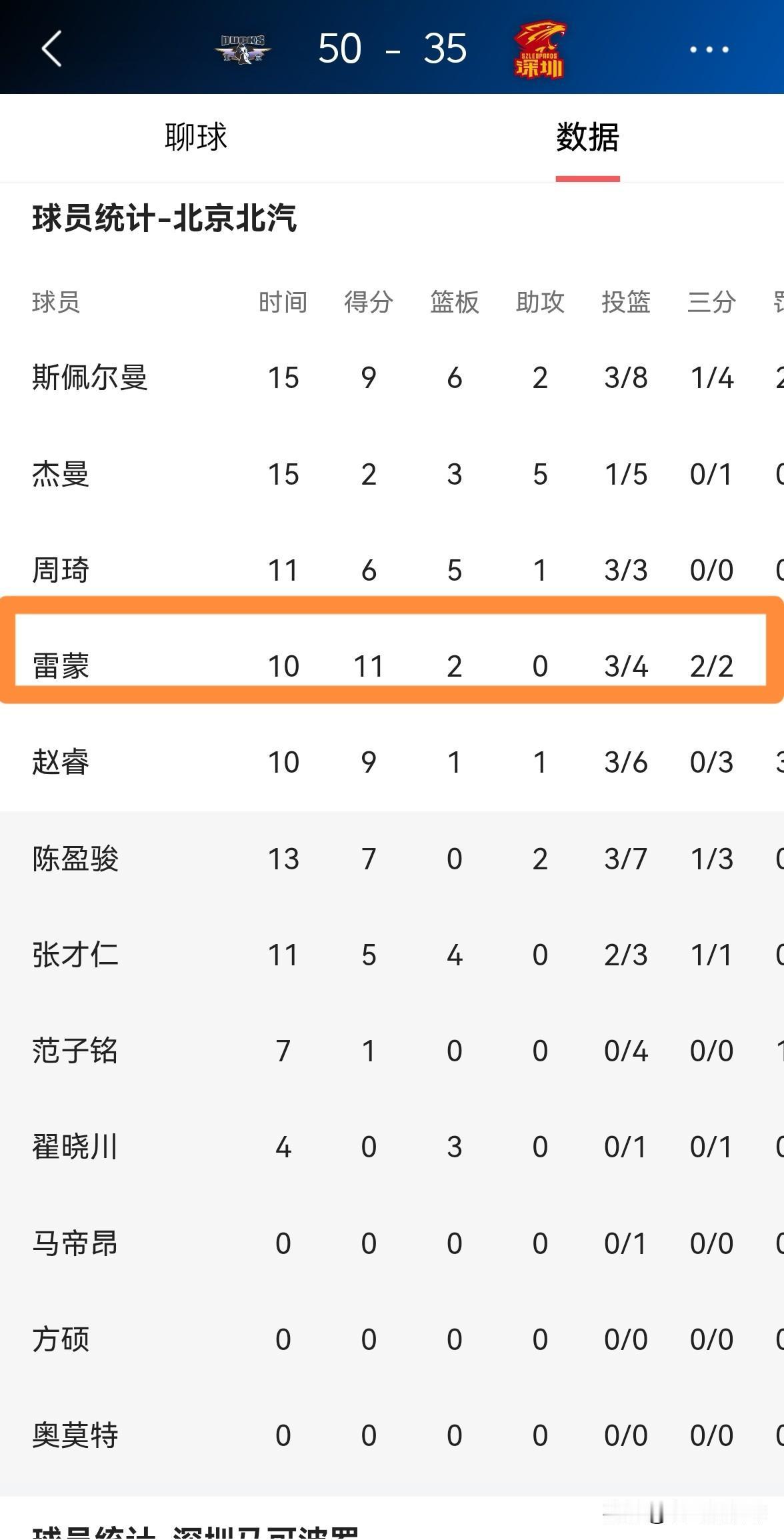 北京北汽大将雷蒙真是大放异彩!在今天北京北汽主场迎战深圳马可波罗的上半场比赛中,雷蒙首发出战10分钟,投篮4中3,其中三分球2中2、罚球3中3极其高效的砍下11分2篮板,没有出现失误,他的场上正负值为+12。 值得一提的是,在第二节比赛中,雷蒙带领球队打出了一波进攻高潮,帮助球队一举建立起了两位数的领先优势。