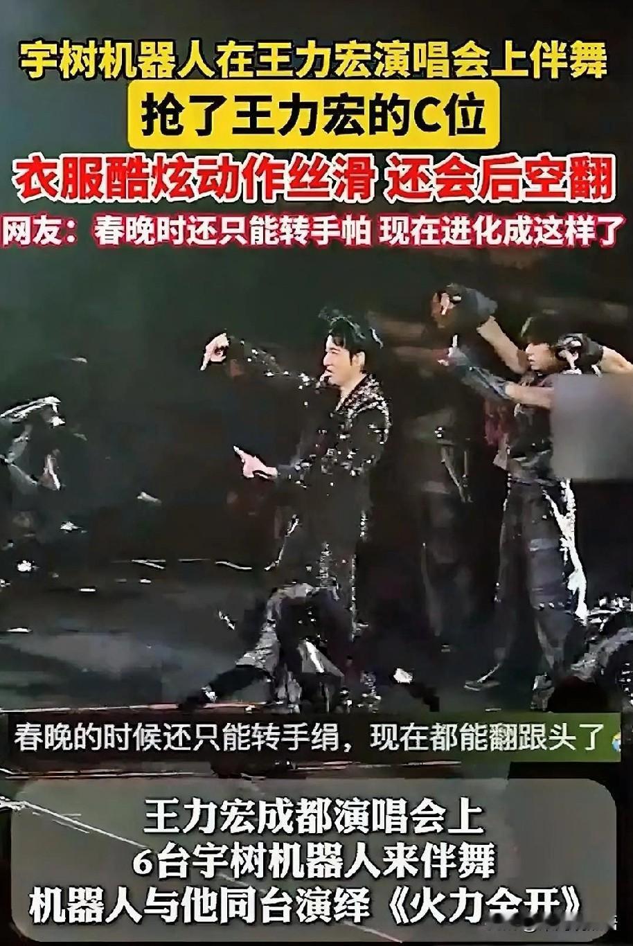 王力宏跟宇树机器人的这场演唱会, 绝对可以称得上是一场划时代的表演。 春晚走路打颤还只会转手绢,没想到这次直接跳舞加空中转体,最主要的是毫无违和感! 6个机器人个个身穿衣服,从头到尾的动作流畅丝滑,毫无违和感。跟随着王力宏的旁边伴舞,以及绝对实力的超高唱功。直接让舞台升华,特别搭配《火力全开》这首歌太应景了,最后那个空翻更是直接引得现场尖叫! 不得不说宇树机器人还是很有看头的,搭配唱歌伴舞还是很有搞头的,你们觉得呢?