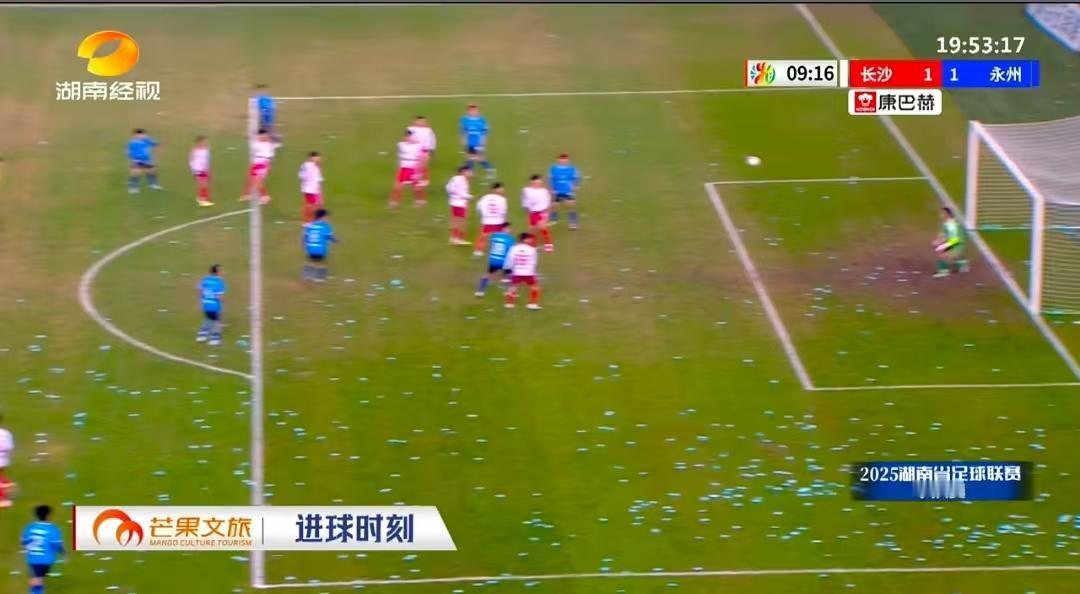 长沙开场4分钟先进一球,主场1:0领先永州。永州球员搞什么,禁区内只有三个球员在防守,第一点和第二点都被长沙队球员拿到了…… 不过,永州立刻在第8分钟扳回了一球,而且是一记世界波。现在比分1:1。 这比赛真的太富戏剧性了,小编还想骂一下永州队,没想到永州就扳平了比分。 不过,我还是要说永州队禁区内的防守,而他们自己的那个进球多多少少有运气成分在那里!
