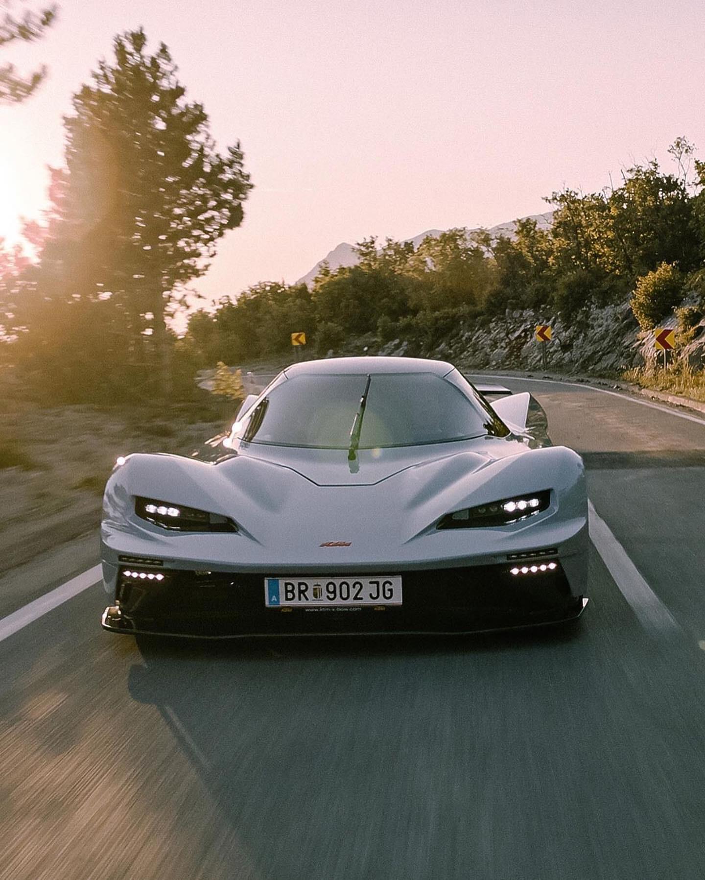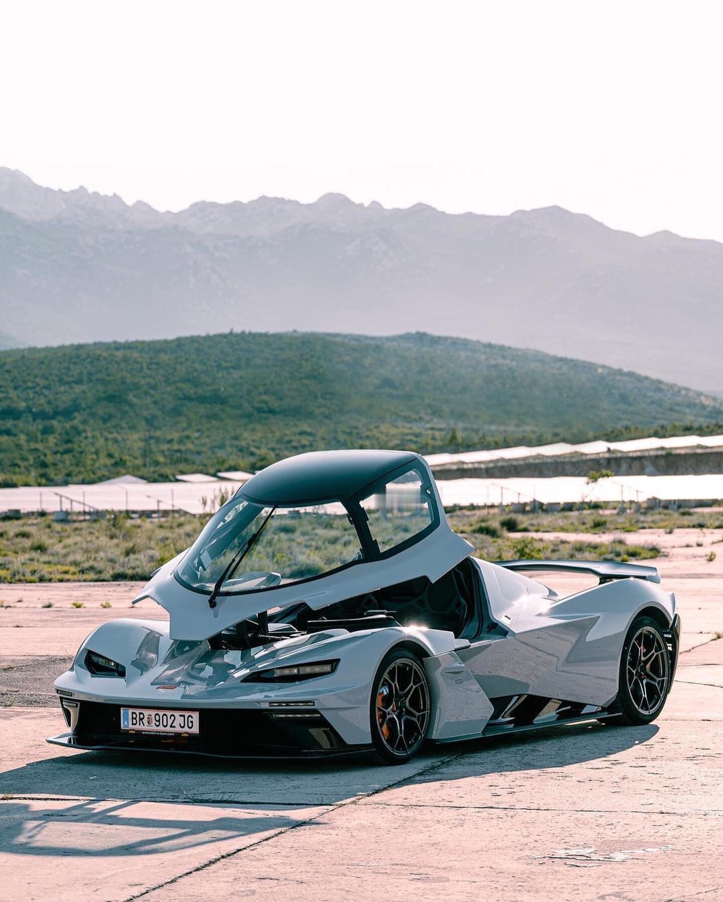 【公路赛道极致融合—X-BOW GT-XR】X-BOW GT-XR是KTM推出的一款将赛道基因与公路行驶完美融合的超级跑车,堪称“不妥协的公路超级跑车” ,以极致轻量化和卓越性能著称。从外观上看,X-BOW GT-XR造型极为夸张,扁平的车头搭配狭长的前大灯组,前包围采用贯穿式通风散热开口,两侧配有LED日间行车灯,带来出色的空气动力学效应;其车身线条低趴修长,采用中置发动机布局,前后翼子板宽大,搭配轻量化五辐式轮圈、多活塞制动卡钳和大尺寸制动盘,车侧线条犀利;车尾配备可电动升起的大尺寸扰流板,尾灯为四点式设计,整个车尾大量裸露碳纤维材质,后包围是具有通风散热功能的尾部扩散器装置;最独特的是它的开启方式,整个顶棚可完全向前外翻,类似战斗机舱盖,充满科幻感,顶棚上还设有可开启的小门。车身尺寸方面,车长约4米6,宽度达2.04米,高度仅1.1米 ,轴距2.8米,离地间隙90mm,呈现出极致的低趴姿态;整车采用全碳纤维单体壳车身结构,干重仅1130-1250公斤,不仅极致轻量化,还具备极高的强度。X-BOW GT-XR还具备出色的安全性和稳定性。高强度、超轻的碳纤维材质打造的车顶结构与碳纤维单体壳,使驾驶舱成为公路车辆中最安全的座舱之一。经过测试,其车顶能承受11吨的重量,是车辆自身总重的七倍多。此外,轻量化的铝合金单体固定卡钳制动系统,能有效制动强大动力,碳纤桶形座椅也为安全提供保障。