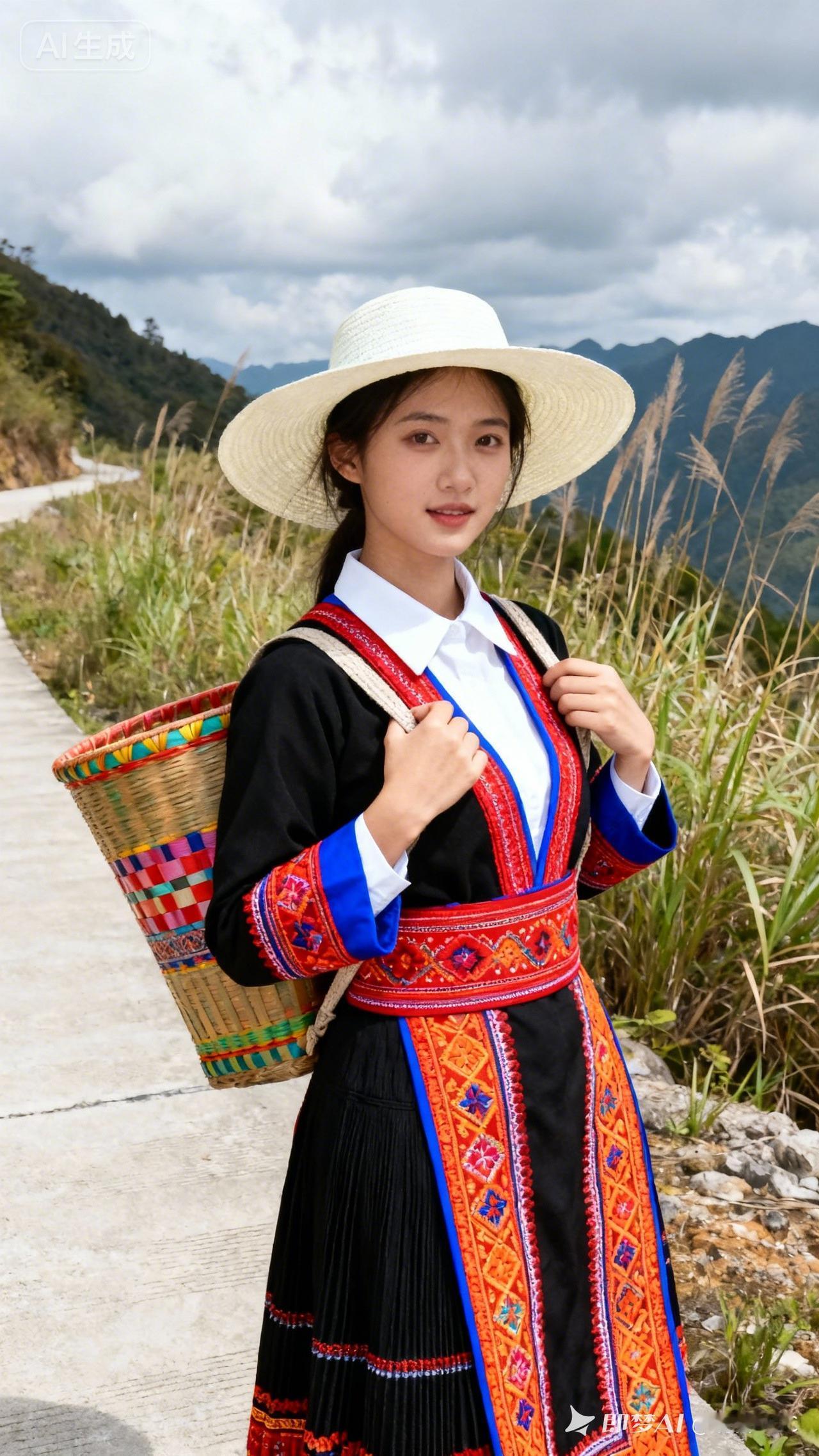山间少女,民族风情,背着竹篓,漫步在乡间小路。