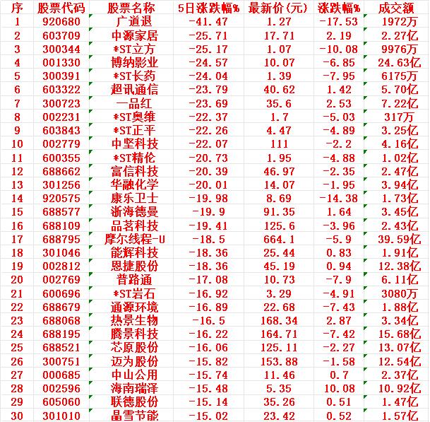 本周,整个市场“跌幅最多”的30名单 广道退:5日跌幅-41.47%,最新价