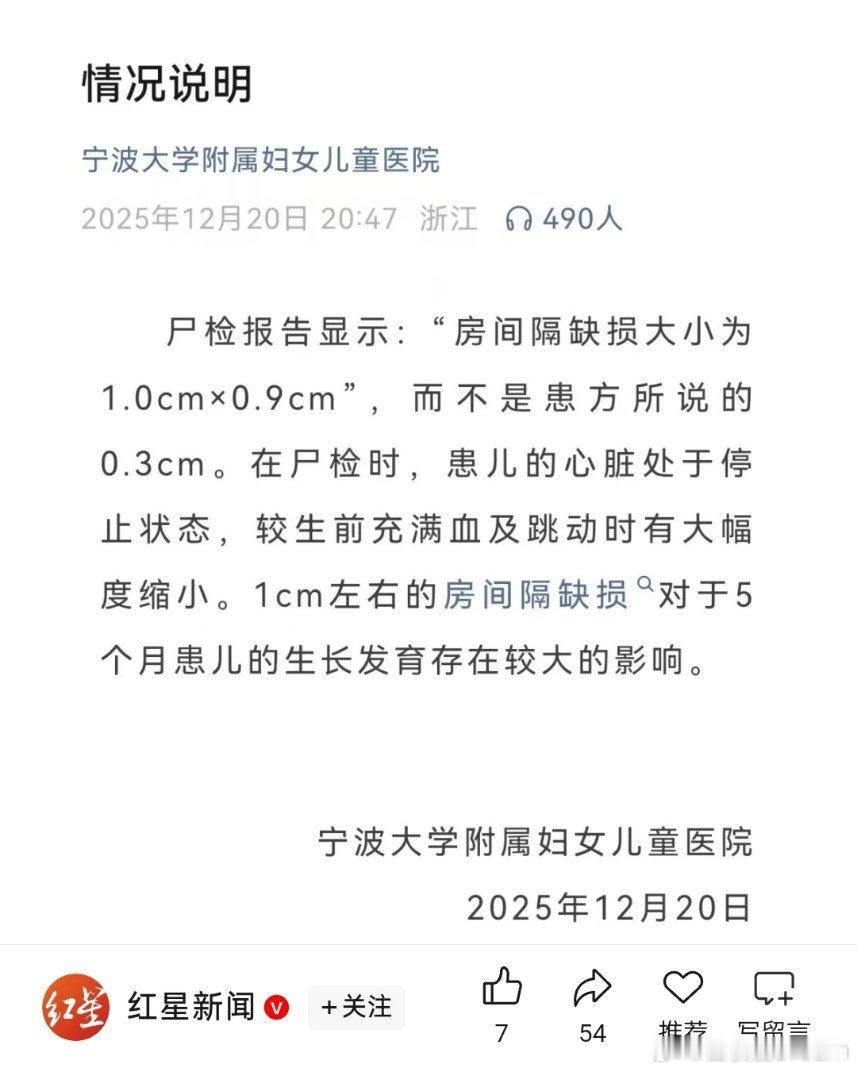 🔻医院回应:尸检报告显示:“房间隔缺损大小为1.0cm×0.9cm”,而不是患方所说的0.3cm🔻理由:在尸检时,患儿的心脏处于停止状态,较生前充满血及跳动时有大幅度缩小涉事医院回应小洛熙尸检报告