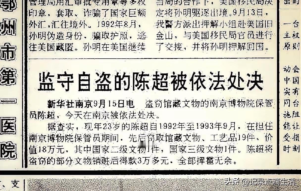 93年的报纸报道了南博内部员工盗窃文物倒卖,获利18万,被判死刑。18万就是死刑,现在8800万的字画也是被盗卖,理应杀一堆坏蛋了。问题又来了,93年盗窃18万就死刑立即执行,现在为啥贪污受贿几个亿也顶多死缓?