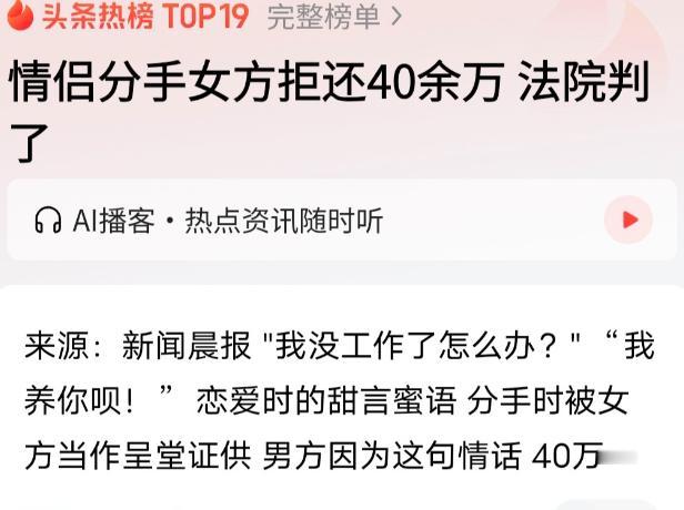 “心寒呐!”上海,男子和女友去见家长,女方父亲都没露面,不久,他发现女友把两人攒的买房钱57万都转给她母亲,之后不辞而别,让男子心寒的是,他和女友开的存房款的银行账户,他往里存了40多万,都被女友转走了,他一气之下将女友告上法院,要求女子返还购房存款322400元,房租26400元,金镯子20000元,订婚金11200元,共计38万,可女友拒绝返还,理由是男子说过“我养你”她把这聊天记录当证据交到法庭上,说这这钱是“养”她的钱,不该还!法院作出公正判决。 上海的小吴提起前段感情,至今还有些恍惚。他和女友小陈原本是同事,2023年底确定恋爱关系后就同居了,而且整个同居期间的生活开支全是他在承担。 两人感情好的时候,还约定一起存钱买房,专门用小陈的身份开了个买房专用账户,密码双方都知道,就盼着攒够钱能有个属于两人的小家。 为了这个目标,小吴每月都会往账户里存1到4万元,不到一年时间就存了41.24万元,小陈也存了少量钱,账户总存款最后到了57万元。那段时间,两人还经常在微信上讨论买房的户型、选哪个区域这些细节,怎么看都是奔着结婚去的。可谁也没想到,变故会来得这么突然。 后来小陈被公司裁员,情绪一直很低落,还问过小吴能不能养她,小吴看着心疼,就安慰她说“以后我养你”。当时就是一句暖心的安慰,小吴没往心里去,可小陈却把这段聊天记录好好保存了下来,这也成了后来纠纷的导火索。 2024年10月,两人开始计划结婚,先回了小吴老家。小吴父母特别满意小陈,不仅热情招待,还直接给了1.12万元的订婚金。 紧接着,两人又去了小陈老家,小吴特意准备了价值2万元的金镯子,还有近3万元的礼品,可到了之后连小陈父亲的面都没见到,最后就吃了两碗面条,草草结束了这次见家长之旅,小吴当时心里就有点不是滋味,但也没多想。 没想到月底小陈母亲来上海和他们同住后,事情彻底变了样。没过多久,小吴就发现那个57万的买房专用账户空了,原来小陈已经把所有钱都转给了她母亲。而且小陈还偷偷删除了小吴手机里两人的聊天记录,之后就跟着母亲一起不辞而别,彻底断了和小吴的联系。 小吴又气又寒,仔细核算后发现,扣除之前小陈帮他还的9万元信用卡欠款,自己实际投入的购房款还有32.24万元,再加上同居时他付的2.64万元房租、给小陈的金镯子折价款2万元,还有父母给的1.12万元订婚金,合计下来有38万元。他一气之下把小陈告上了法院,要求返还这些钱。 可庭审时,小陈的辩解却让小吴大跌眼镜。她声称小吴说的购房款早就用在两人共同生活开支上了,还提交了几十页的账单,里面甚至包括网购内衣的消费记录; 她还否认了订婚的事实,说金镯子已经归还,订婚金更是不存在;最后她拿出那句“我养你”的聊天记录,直言小吴转的所有钱都是“养她”的生活费,属于无偿赠与,根本不该还。 双方各执一词,尤其是在“是否共同攒钱买房”“金镯子有没有归还”这些关键问题上,说法完全相反。 为了查明真相,法院委托测谎机构对四个核心问题进行了测试,包括是否有共同存款买房的事实、金镯子是否已归还、是否有14万元现金往来以及1万元红包是否返还。测试结果很明确,小吴全部通过,小陈则全部未通过,说谎的痕迹一目了然。 法院最终认定,小吴的大额转账是基于共同生活和结婚目的的款项,并不是无条件的赠与。结合案件事实,酌情判决小陈返还小吴30万元,其中包含了相关款项和金饰的折价款。 除此之外,小陈还要承担小吴6000元的测谎费,以及7000元诉讼费中的大部分。 一句随口的安慰,终究不能成为侵占他人财产的借口,这个判决也算是给了小吴一个公道。 信源:荆楚网