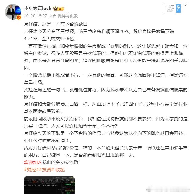 片仔癀,弱势反弹不值得操作周五有位群友请我看看片仔癀是否能做?我的意见是不值得操作,空间太小了。我曾经在10月20日写过一篇关于片仔癀的文章,我认为10月20日的跳空缺口是在下台阶的标志。我还说了茅台、片仔癀不会消失,但是会失去十年。像片仔癀这样千亿市值的股票,每天就2-3亿的成交量,可以说是无人问津了。片仔癀,这样的股票,股东人数不断的增加,老登们不断的补仓,机构投资者不断的离场,正在沦落为老登大本营。任何股票都不会一直跌,但是我们必须评判他的上涨空间,我认为片仔癀的反弹空间是很小的。我认为他每一次反弹都是给你减仓的,如果你因为他长期下跌偶然上涨,产生反转的幻觉,只能是害了自己。你不要跟林园学,每天2-3亿的成交,他想认错都没有机会,他只能一错到底了。茅台、片仔癀不会消失,但是会失去十年,我还是这句话。欢迎加入我们的免费交流群财经股票