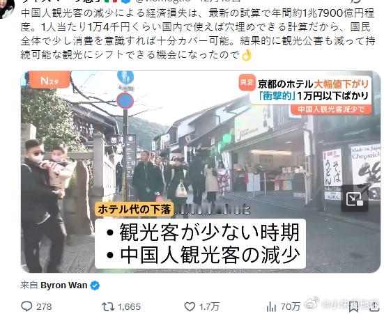 日本人称:据最新估算,中国游客减少带来的经济损失每年约为1.79万亿日元。经计算,只要(日本)每人均摊在境内消费约1.4万日元(约合人民币670元)就能填补这个缺口。因此,只要全体国民稍微提高一点消费意识,就完全可以覆盖损失。结果反而减少了观光公害(过度旅游),成了向可持续旅游转型的契机,挺好的!日本旅游海外新鲜事日本