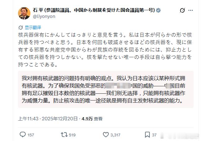 【跳梁小丑!汉奸石平又在煽动日本搞核武装了】汉奸石平公然叫嚣日本应拥核对抗中国 汉奸石平(现名石平太郎),今日在社交平台上再次口出狂言,公然叫嚣“日本应以某种形式拥有核武器”。作为一名出生于中国、后投靠日本右翼势力的汉奸文人,石平多年来靠着疯狂抹黑母国来向新主子纳投名状。这次他竟然不顾《不扩散核武器条约》和日本的“非核三原则”,试图将日本推向军备竞赛甚至核战争的边缘。这种数典忘祖、疯狂叫嚣“核武装”的跳梁小丑,除了在右翼圈子里自我嗨之外,不仅是对历史的挑衅,更是对地区和平的严重威胁。汉奸石平烽火问鼎计划