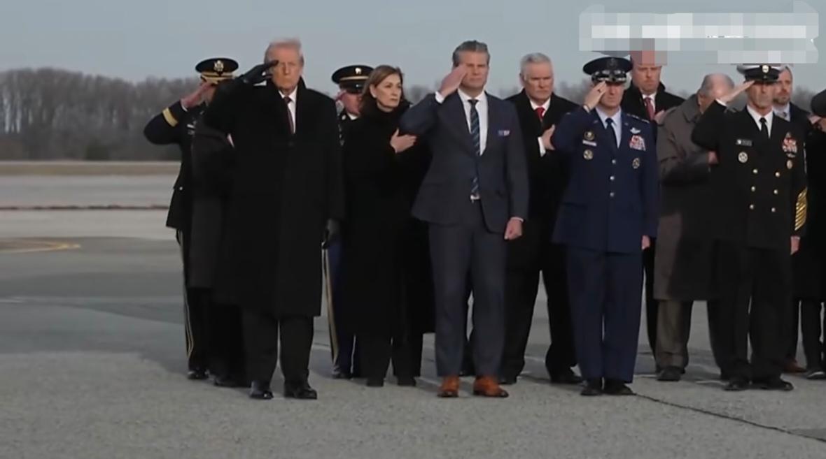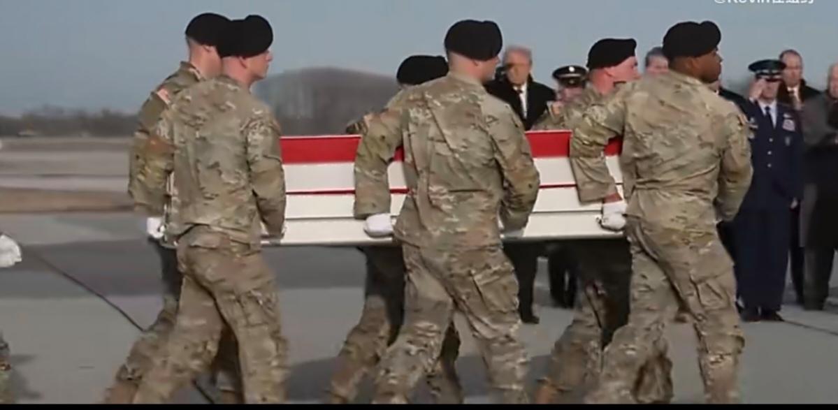 特朗普在国防部长陪同下,亲赴特拉华州多佛空军基地出席3名在叙利亚遇难人员的迎灵仪式。 寒风中特朗普一行伫立在空军运输机舱门前。当护柩士兵将覆盖美国国旗的灵柩逐一抬下飞机时,现场人员肃立致敬。 3人于13日在叙利亚中部城市巴尔米拉遇害,当时袭击者针对美军与叙利亚部队组成的车队发动攻击,随后被击毙。另有3名美军受伤。