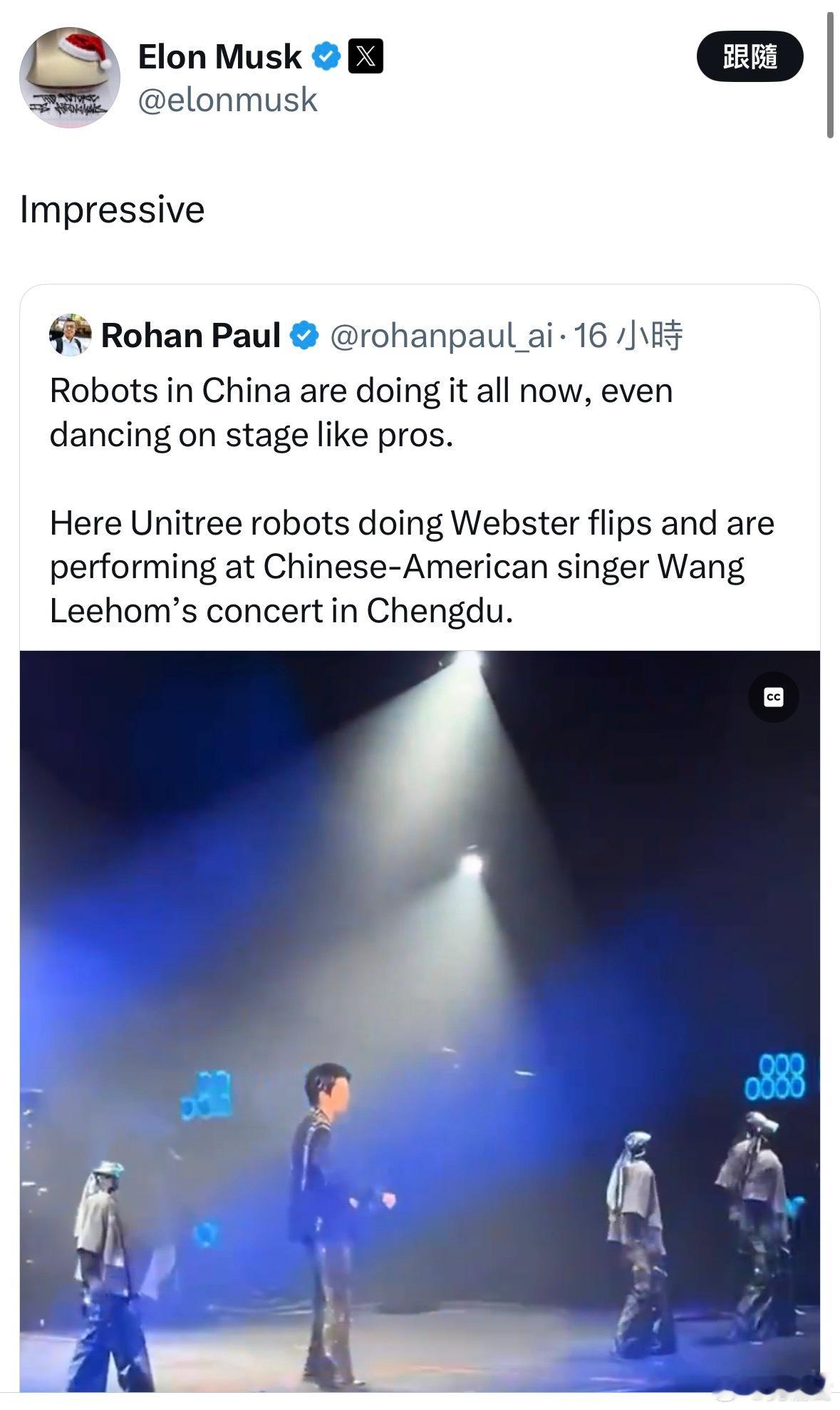 埃隆·马斯克在社交平台转发王力宏演唱会机器人伴舞的视频,并配文称「令人印象深刻」