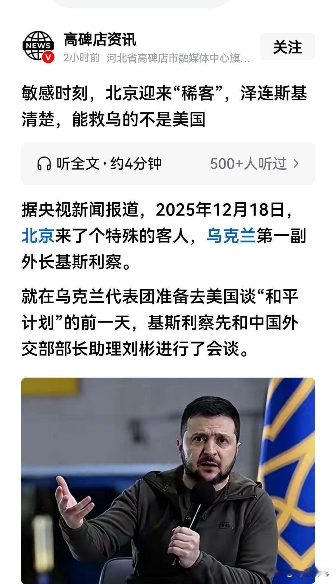 2025年12月18日,乌克兰第一副外长基斯利察忽然来到北京… 在关键时刻,泽连斯基想到了中国,难道他终于知道美欧不是朋友,不是真心在帮乌克兰了?