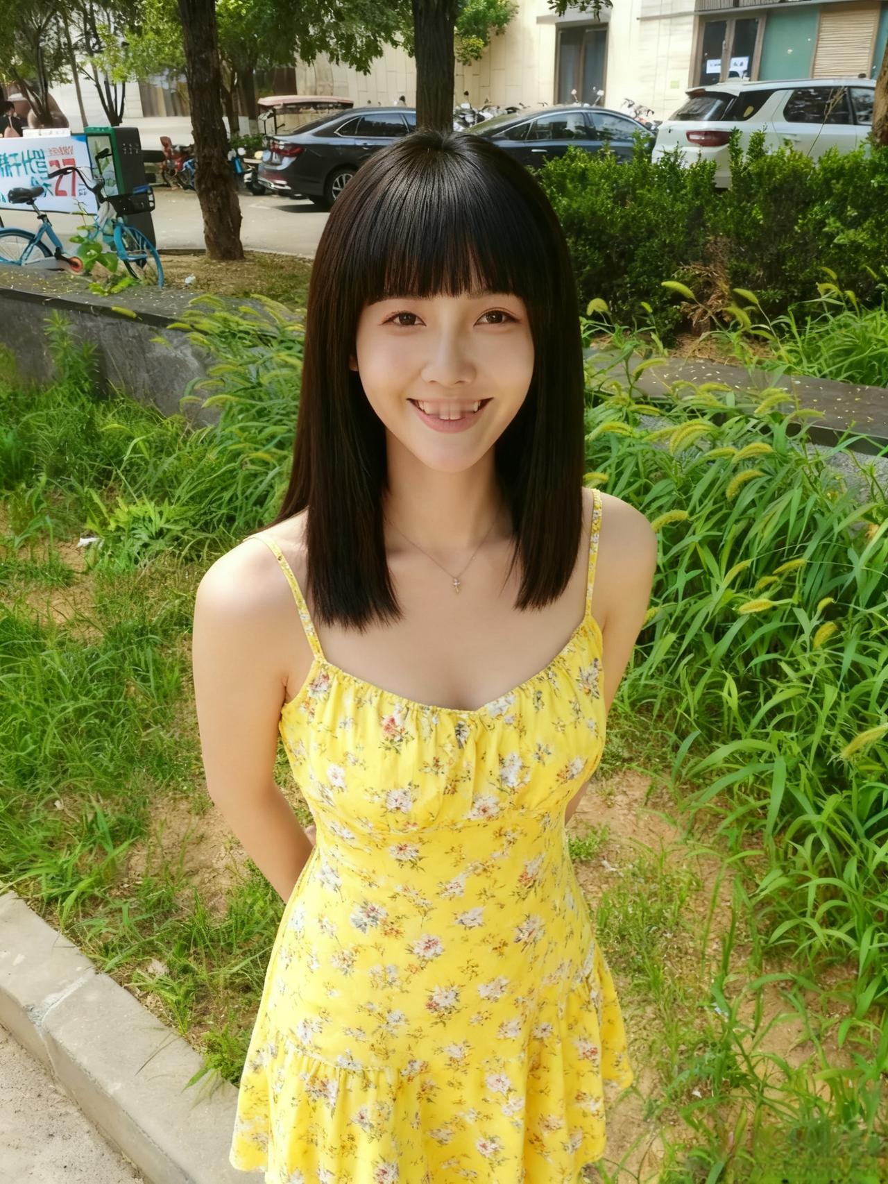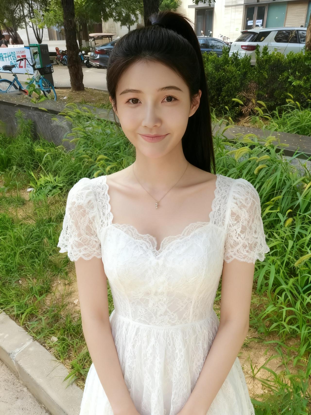 裙袂飘飘立芳茵,笑靥如花映月轮。 不与群芳争艳色,天然风韵更真纯。