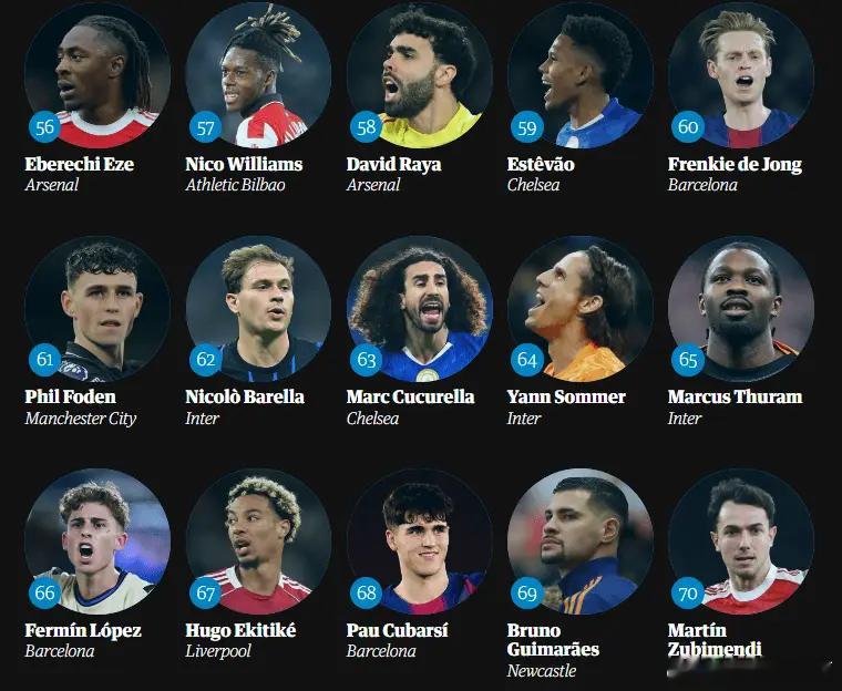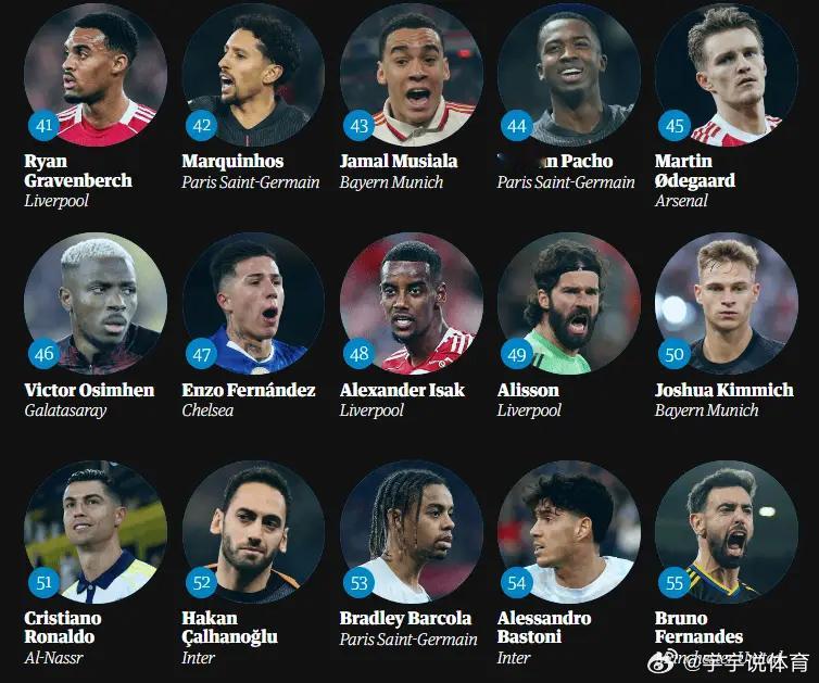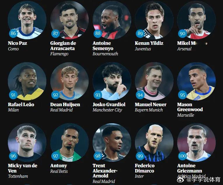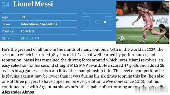卫报列出2025世界足坛11-100位球员排名,梅西位列第34位。