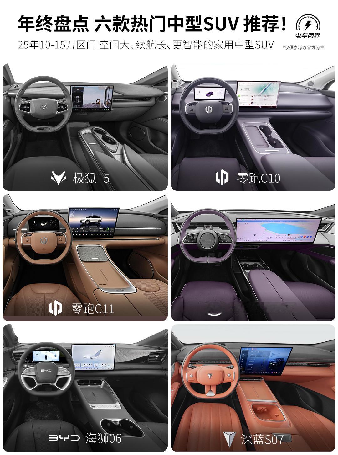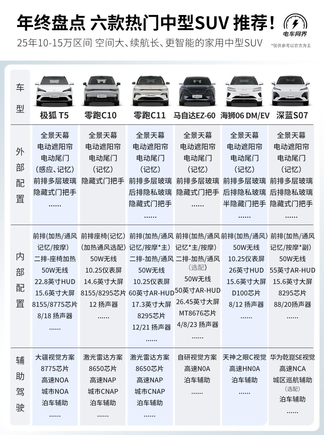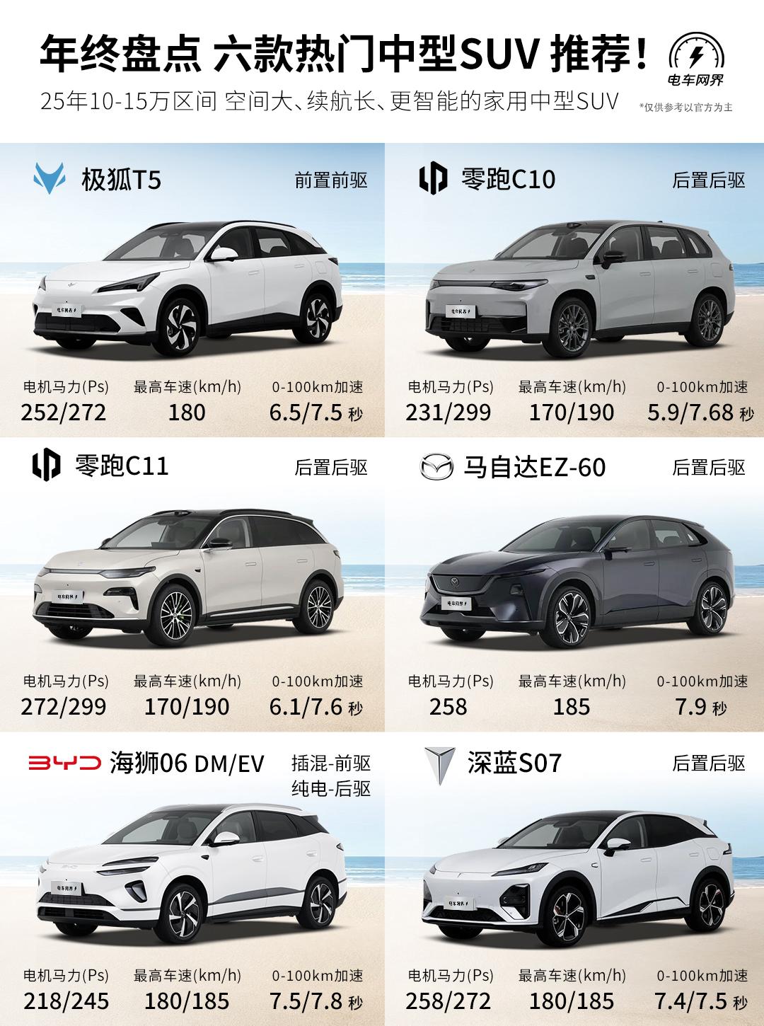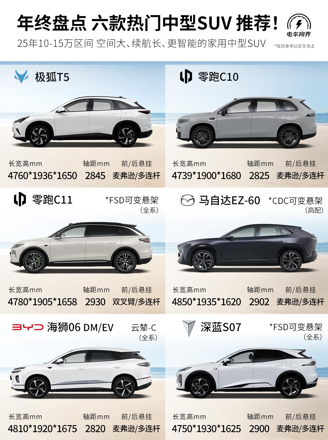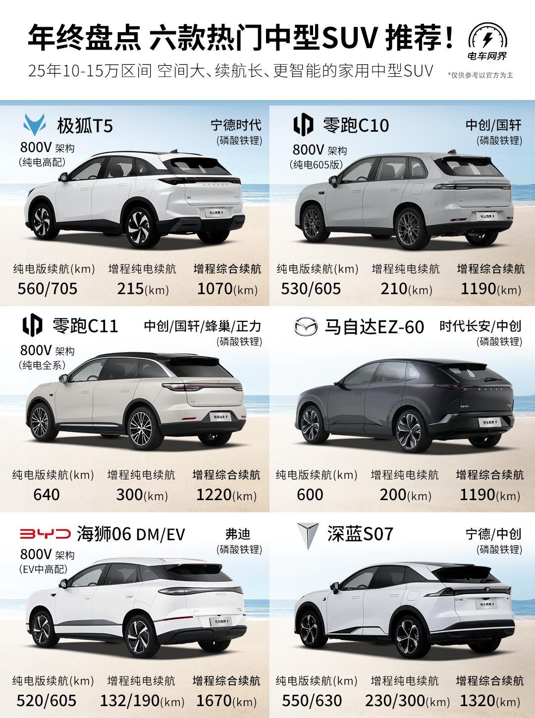 年终盘点,这六款主销区间10-15万级,空间大、续航长、更舒适、更智能的家用中型SUV,:极狐T5、零跑C10、零跑C11、马自达EZ-60、海狮06、深蓝S07,谁才是你心中的不二之选呢? 26款极狐T5:新增了增程版车型,综合续航达1215km,纯电续航220km,同时保留纯电版本,CLTC最高续航705km。轴距达2845mm,后排空间更宽敞,采用大疆双目视觉方案,支持城区、高速NOA、泊车辅助等。 零跑C10:凭借高性价比和全栈自研技术在市场中表现亮眼,连续多月居中型SUV销量前列,纯电版800V+激光雷达在同级中很有竞争力。 零跑C16:作为零跑C系列的顶梁柱,以15万级的价格实现了“冰箱彩电大沙发+全域800V+激光雷达”的全能产品力,对家庭用户有着极大的吸引力。 马自达EZ-60:作为合资品牌定价非常有诚意的中型SUV,外观深受马粉喜爱,全系26.45英寸一体悬浮大屏有科技感,4nm车规级芯片(MTK9676)实现行泊一体的辅助驾驶功能。 海狮06:比亚迪海洋网今年重磅车型之一,上市后迅速成为市场爆款(宋PLUS后继有人了),可看做同级中的“全能家用SUV”,选它不会错的车型。 深蓝S07:中型SUV市场多年的热门车型,凭借华为乾崑智驾系统的全系标配、增程/纯电双动力的灵活选择,以及豪华配置,成为家庭用户和看重辅助驾驶可靠性的不错选择。【来自懂车帝车友圈】