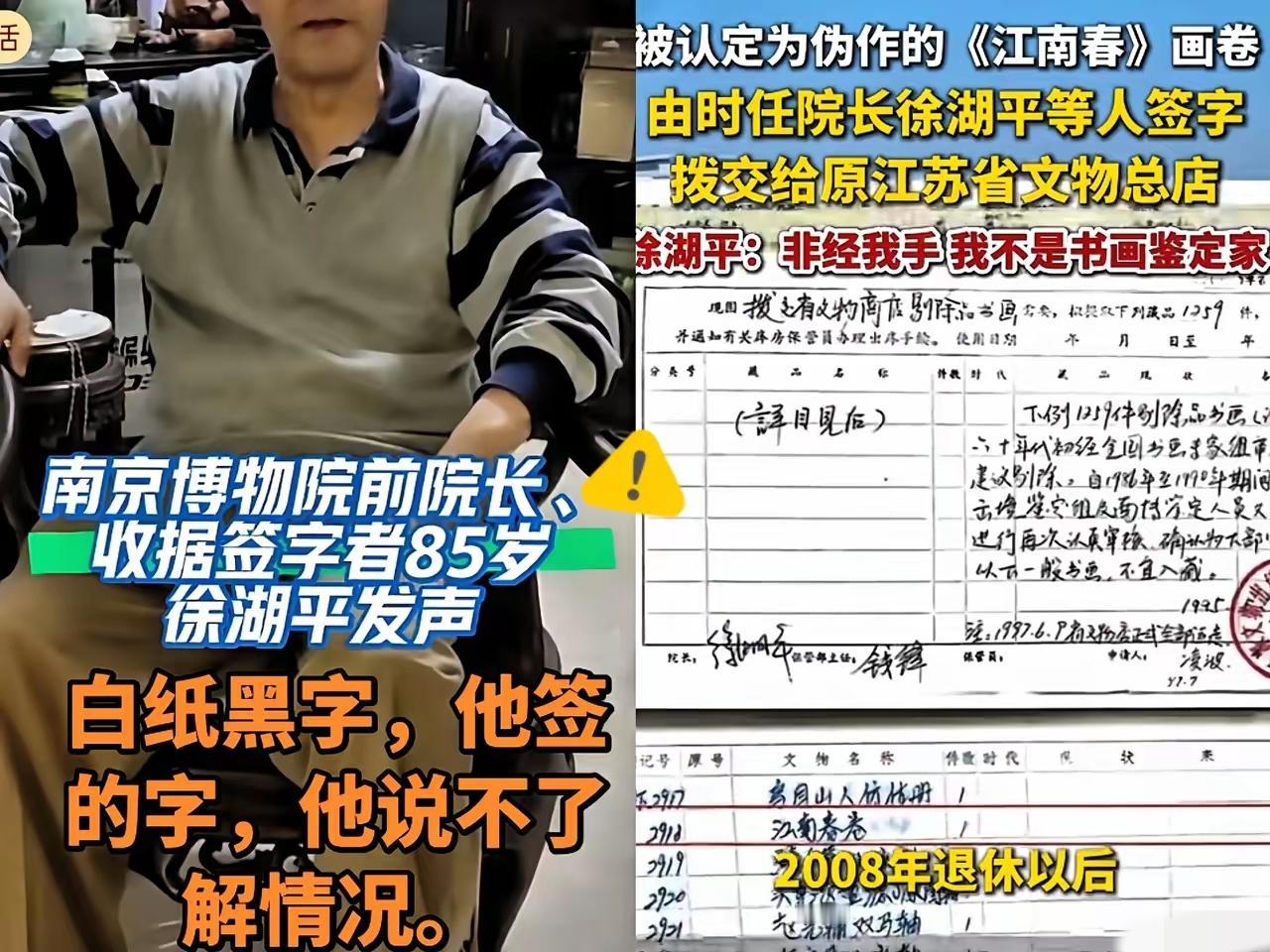 前南京博物院院长徐湖平坐不住了! 都80多岁了,突然就站出来发声明, 说自己退休20年了,早就 不管院里的事了,这次捐赠品出的乱子跟我可没关系。可网友不买账呀 一句“没经手、不是鉴定家”就想翻篇?1997年文物划拨单上的亲笔签名,可不是随便画的圈。更讽刺的是,当年他既是南博负责人,又是接收文物的省文物总店法人,左手倒右手的操作,怎么看都透着蹊跷。 从6800元“伪作”到8800万天价拍卖品,《江南春》的身价暴涨背后,是捐赠者的善意被辜负,是国有文物的监管漏洞。退休从不是免责金牌,签字就意味着担责,2012年的实名举报没下文,不代表真相会被时间掩埋。 文博圈的信任,容不得这般含糊其辞。真正该查的,是身份重叠下的利益输送空间,是文物处置中的程序正义。你觉得这事儿该只追究个人,还是要深挖背后的监管漏洞?