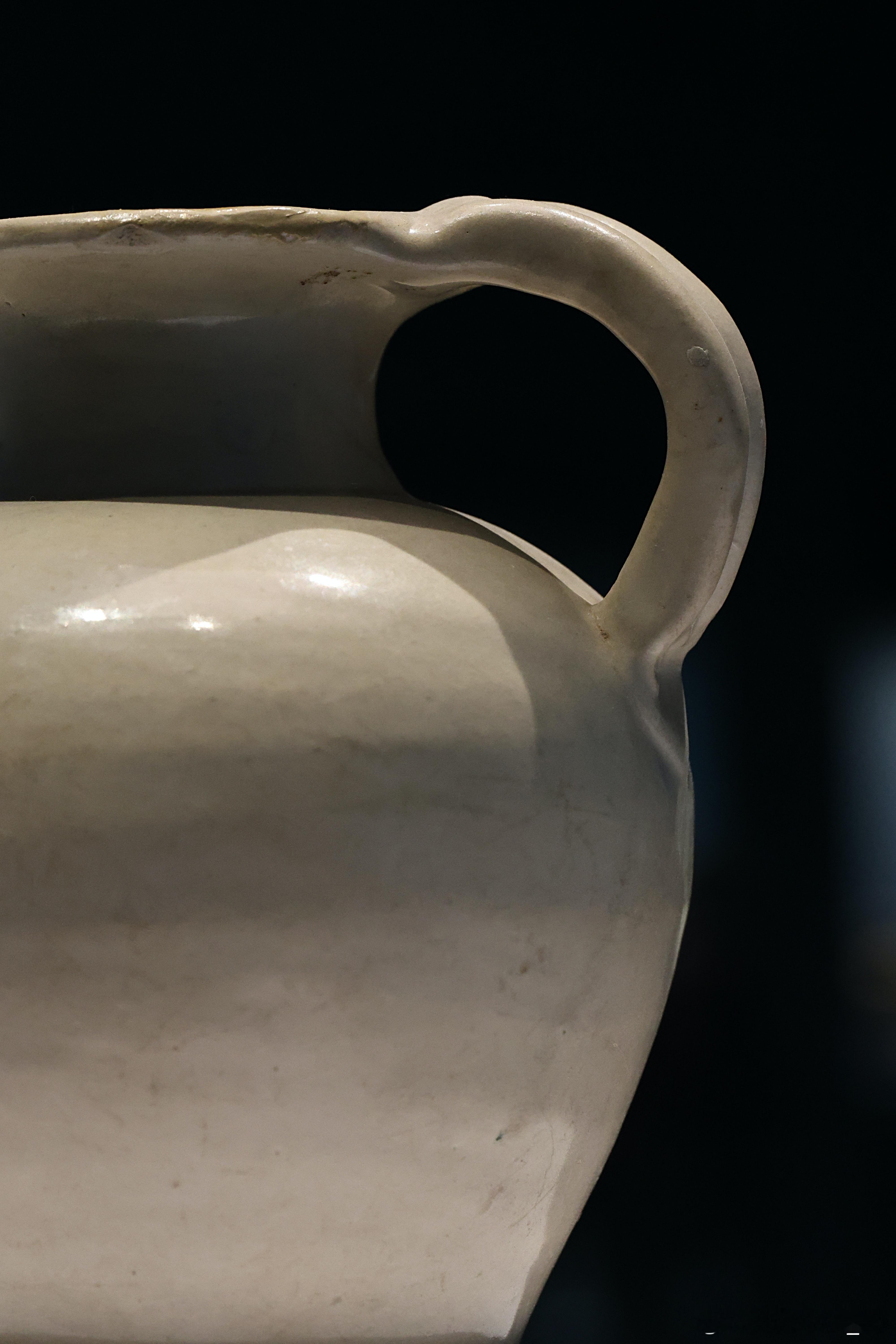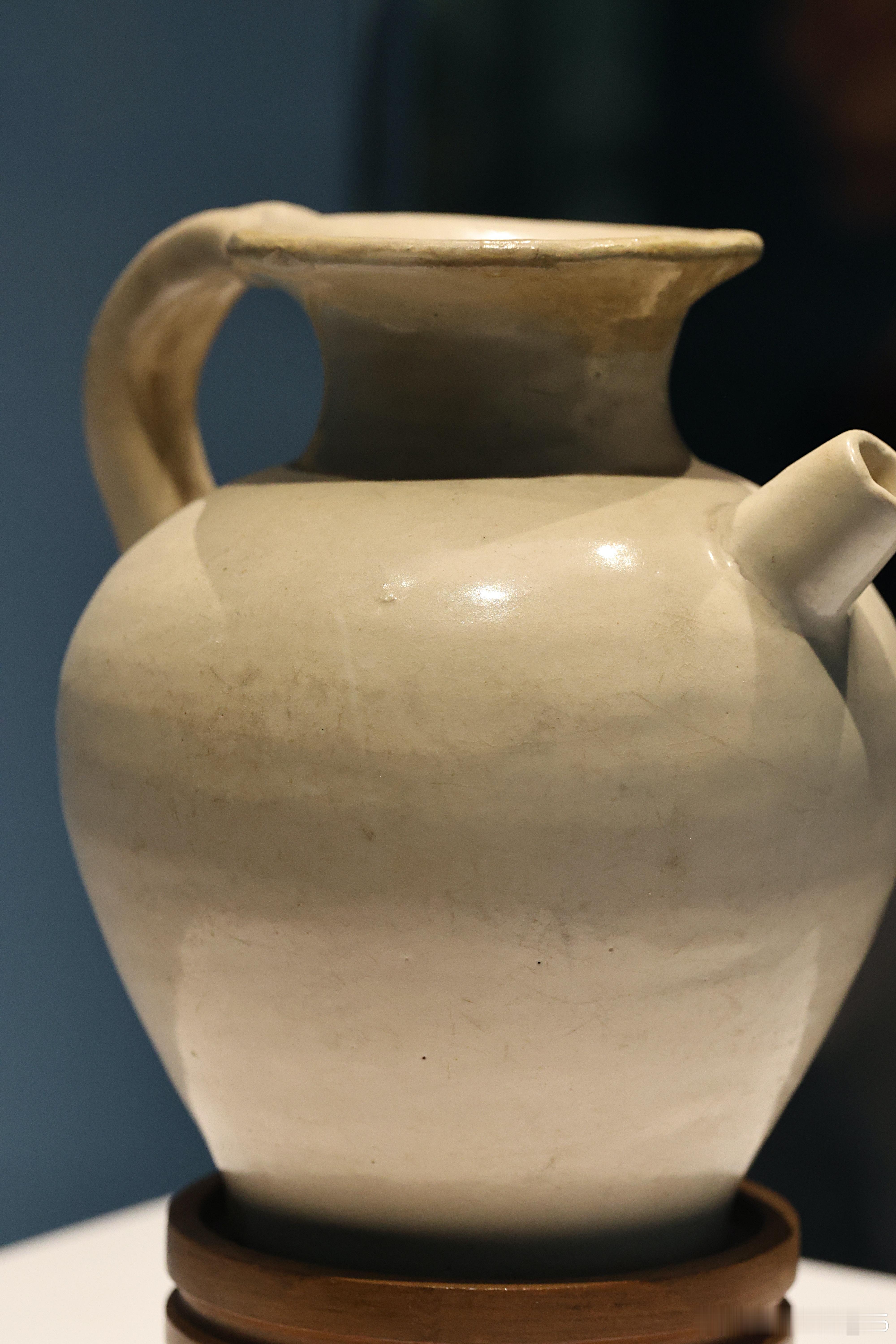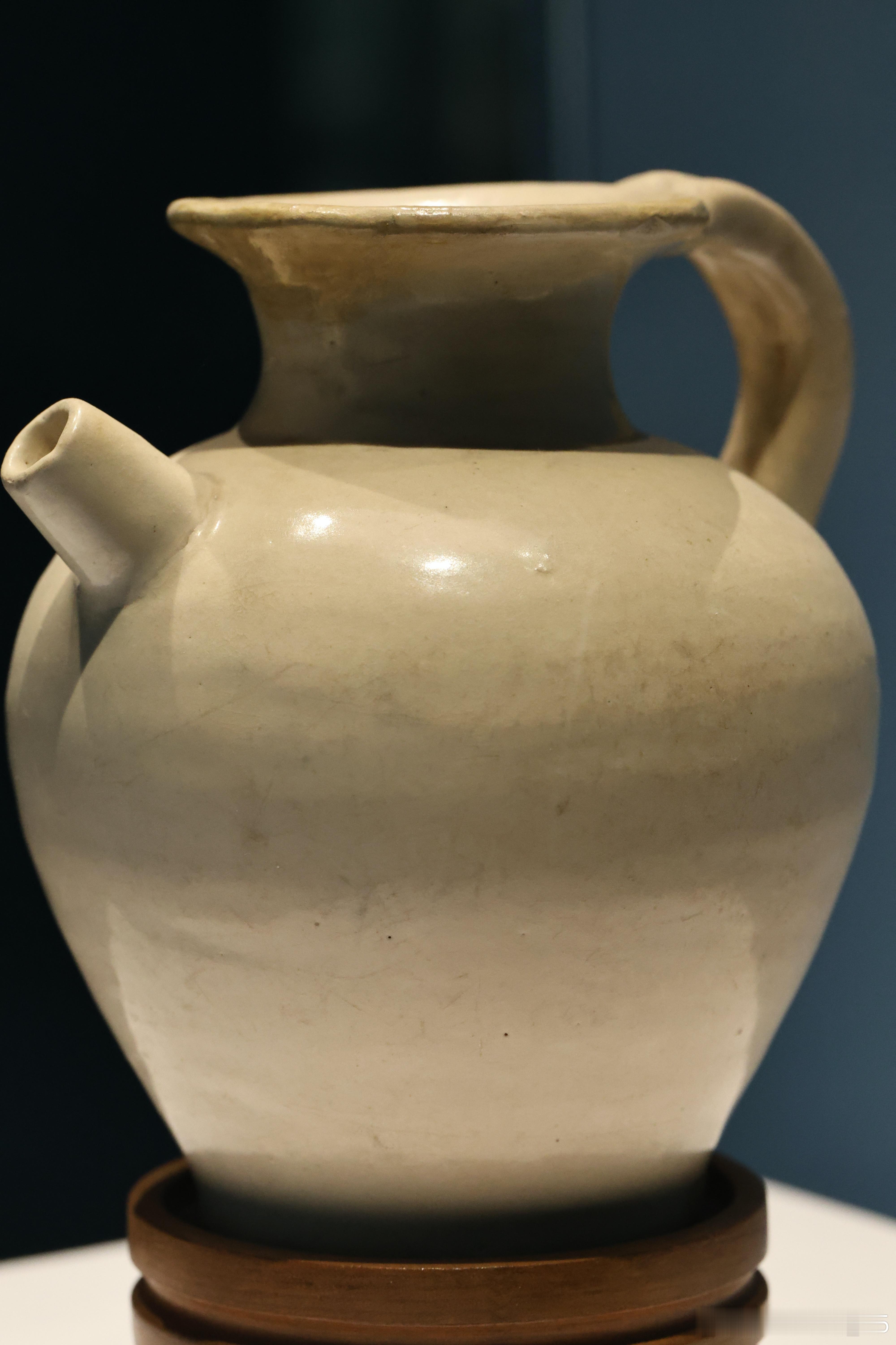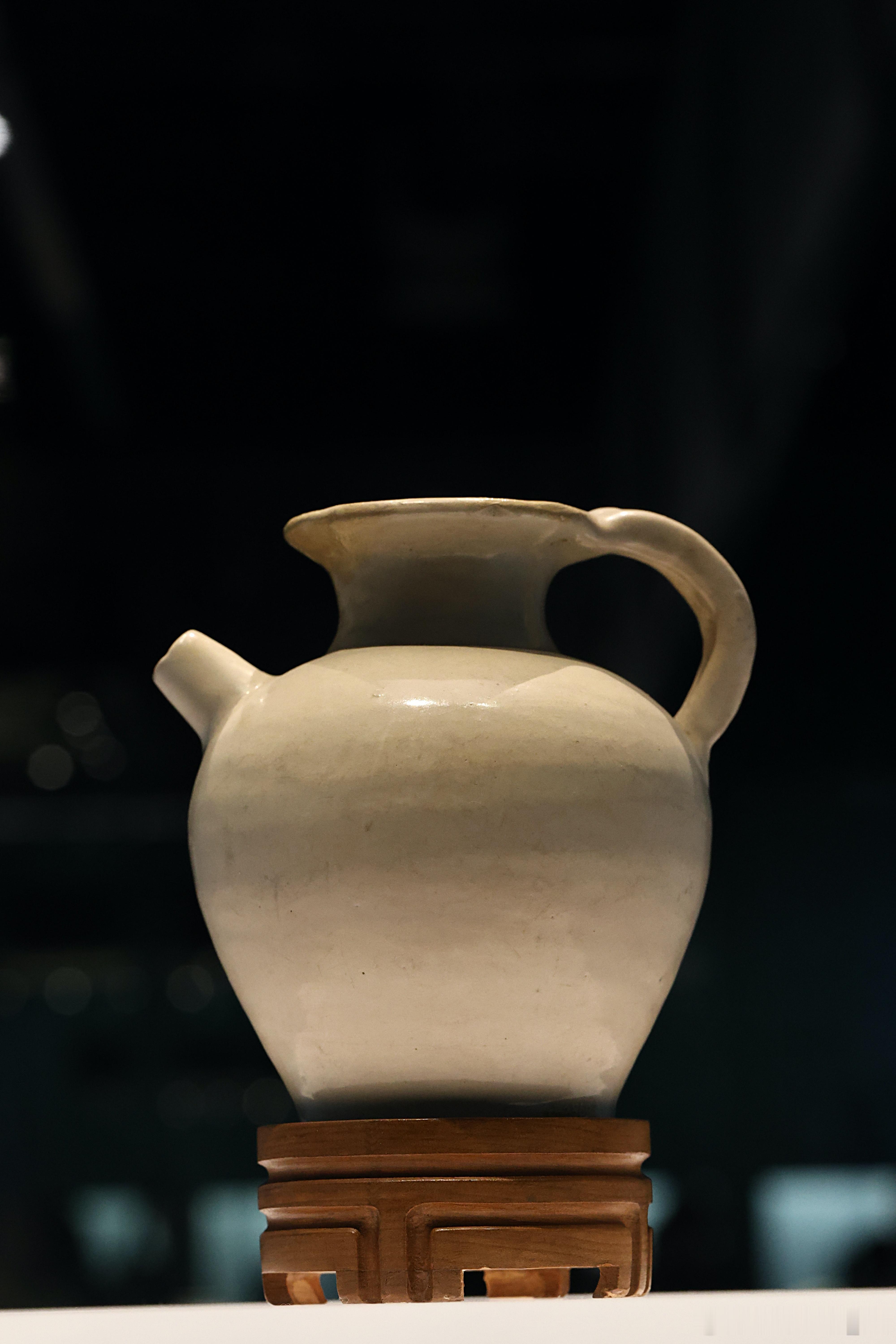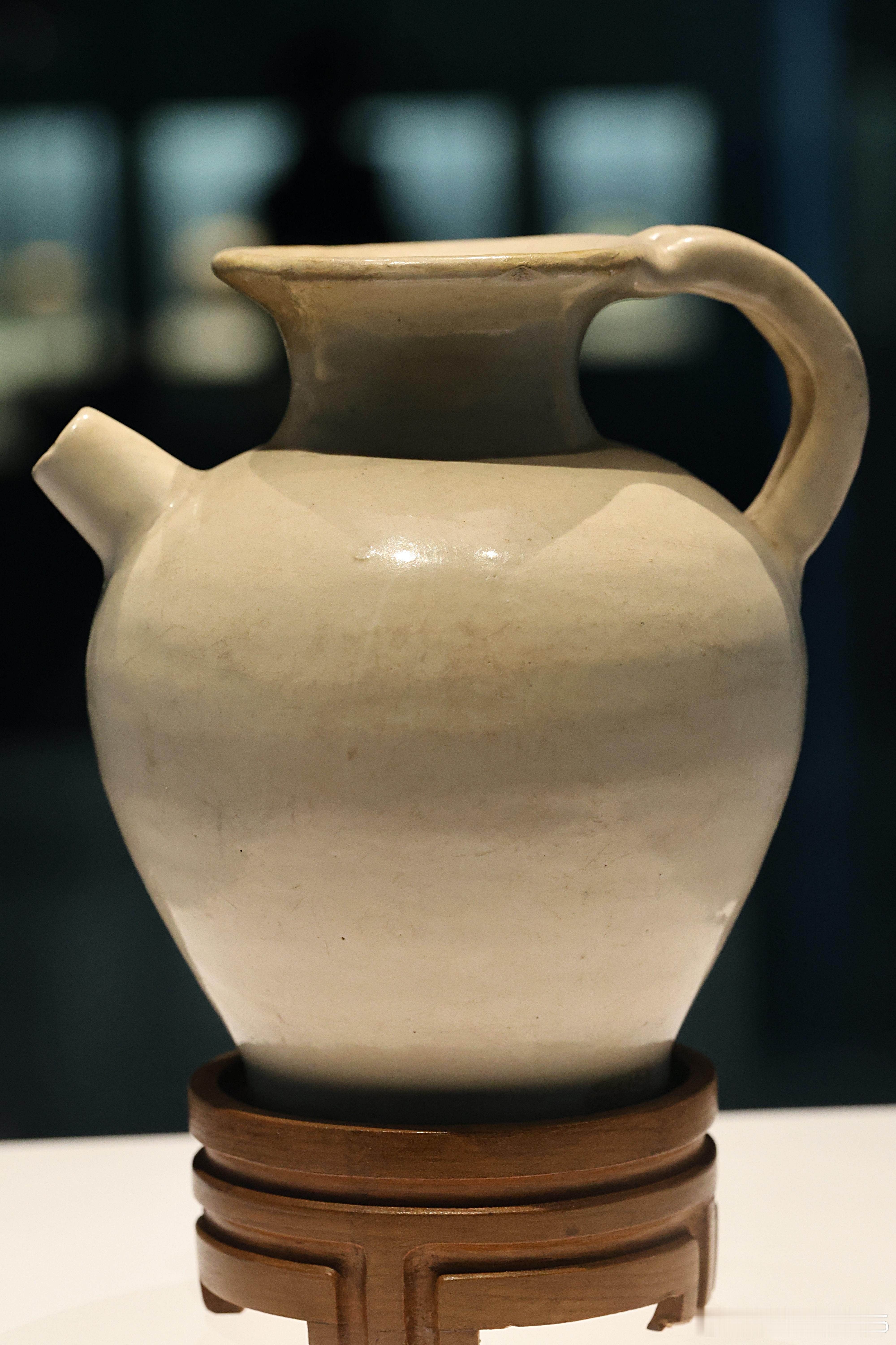 白釉执壶 唐 (618-907年)国家博物馆藏1958年河南三门峡陕州区出土。此壶是唐代执壶的典型样式。执壶在文献中常备称作“注子”或“注壶”,是唐代出现的新品种。隋唐墓葬出土的白瓷以各种日常生活用具为主,如盏托或盏等,与当时饮茶风俗的流行有关。