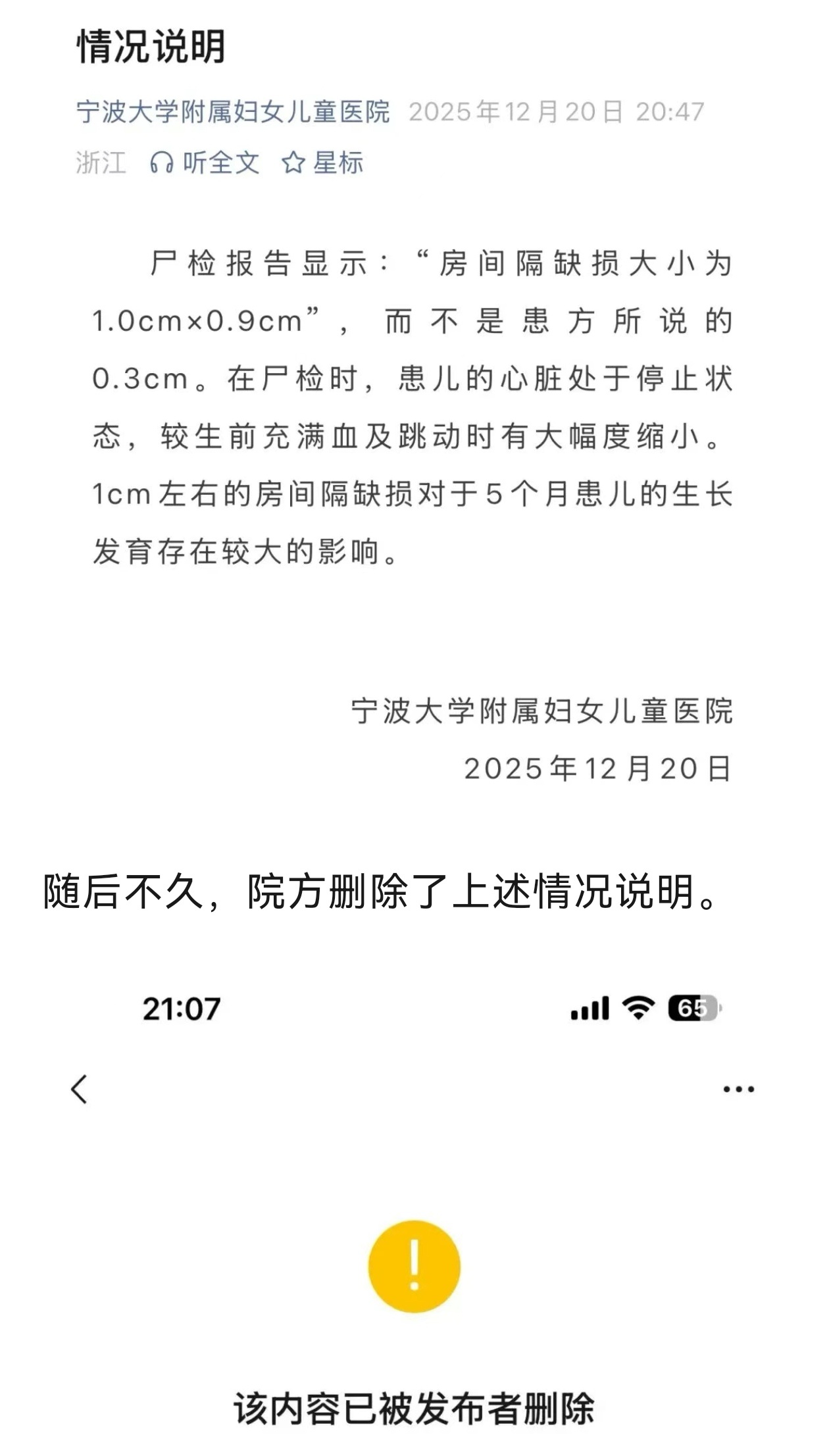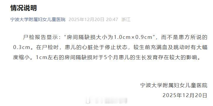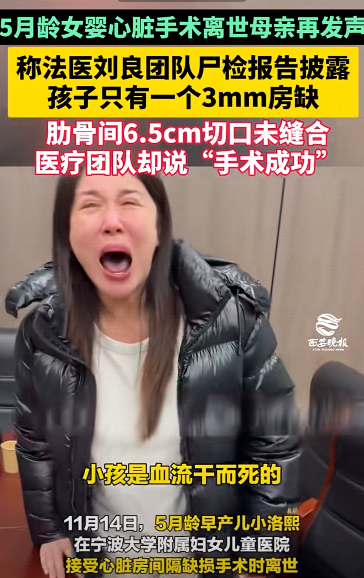 2025年11月14日,5月龄早产儿小洛熙在宁波大学附属妇女儿童医院接受心脏房间隔缺损手术时离世。12月20日20时47分,涉事医院发布情况声明,辩称尸检时心脏已停跳、无血,尺寸比活体小,并坚称1cm房缺对5个月婴儿有影响,暗示手术指征成立。随后,该声明被自行删除,院方再未给出任何解释。涉事医院回应小洛熙尸检报告医学专家解读小洛熙房间隔缺损手术在我看来,涉事医院“删稿式回应”,引发次生舆情同时,也能看出院方的不服气,即便是宁波市卫健委已于12月14日做出正式调查、处罚的通报,院方依旧认为手术是“成功”的,这不仅是在刻意与舆论抬杠,更涉嫌逃避“医疗欺诈”责任。在我看来,面对5个月大的早产儿,涉事医院将3毫米可自愈的房缺,说成必须紧急手术的复杂畸形,还把创口敞开不缝,这已经不是技术失误,而是原则性错误。希望院方正面回答,为何未缝合?为何术前诊断冠状窦型房缺却未检出?涉事医院回应小洛熙尸检报告