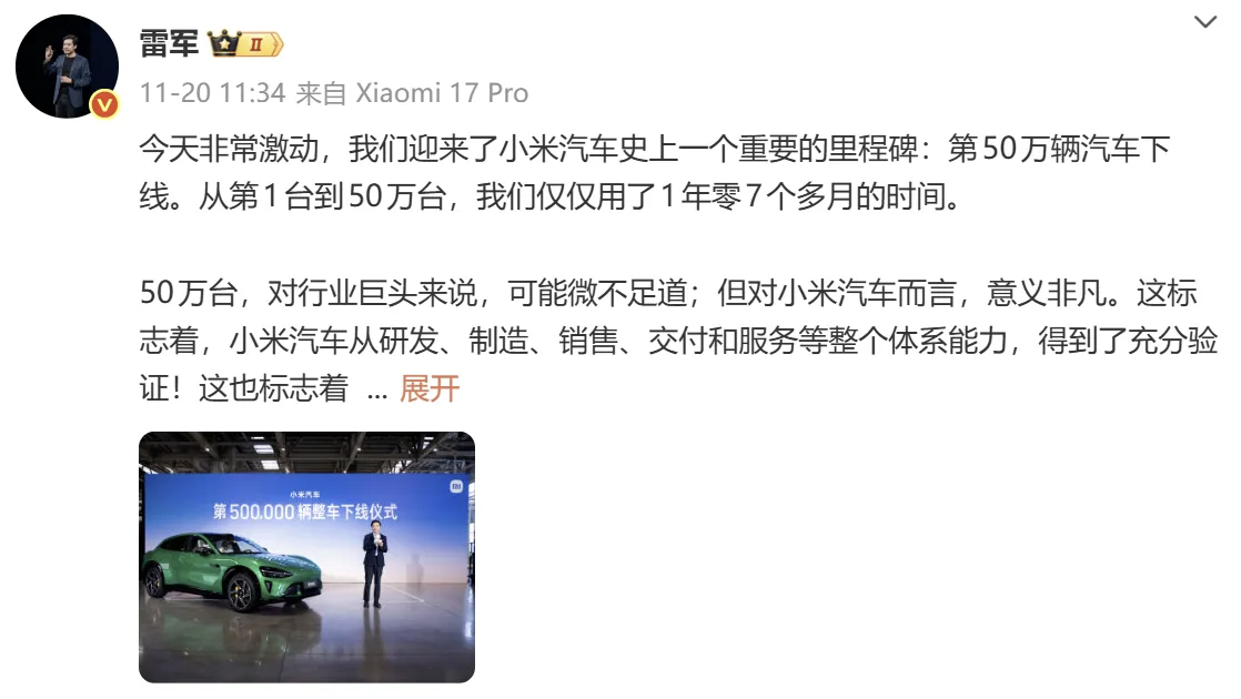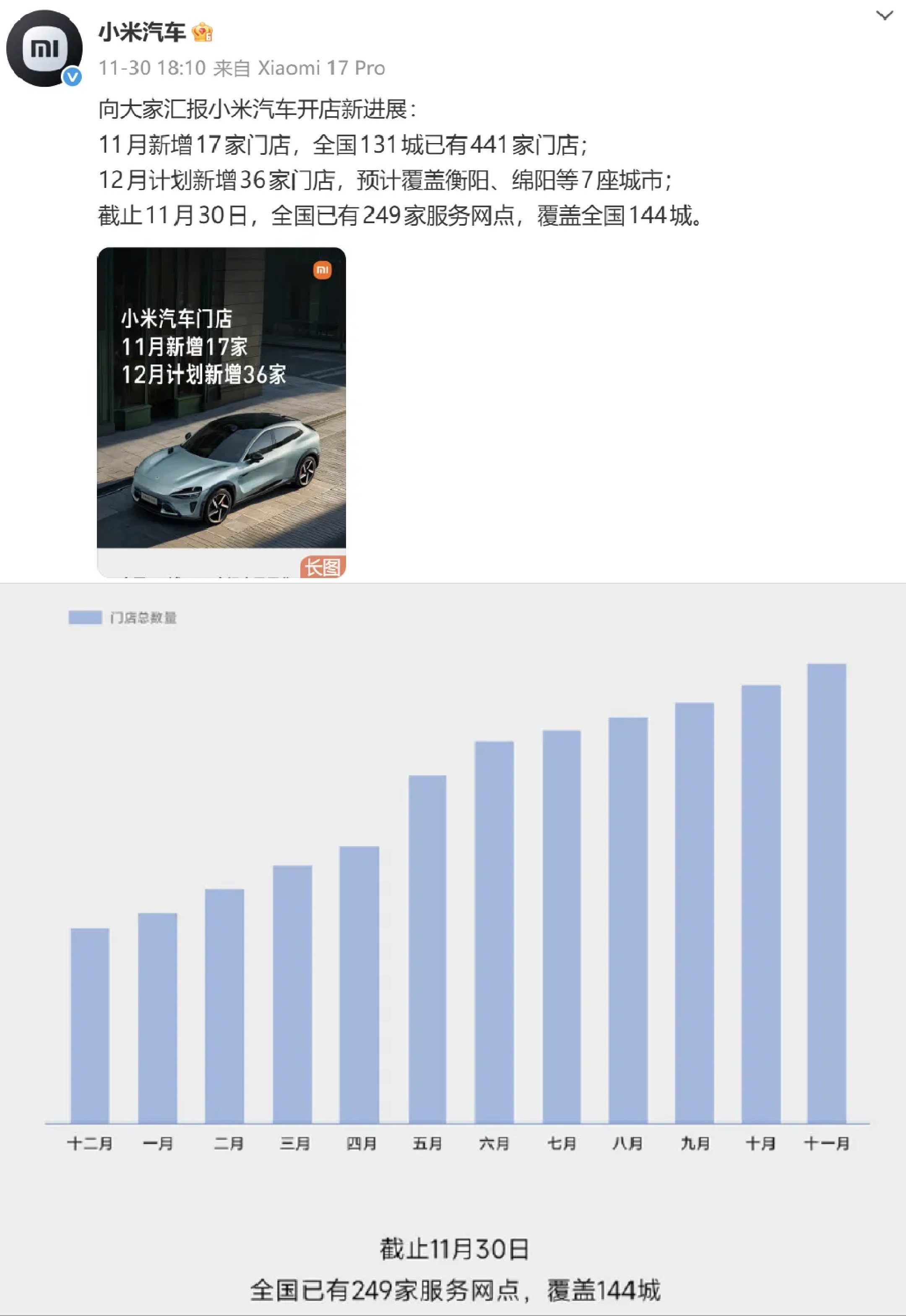 近期,小米公司再次开创行业先河,给全国经销商发放总额超1亿元资金补贴,主要针对“车融合店”经销商,具体来看:2024年建成的门店,每家补贴10万元;2025年12月15日前新建并验收的门店,每家补贴50万元;不设任何捆绑条件,直接打到经销商账户。满谈汽车据悉,小米此次“答谢合作伙伴”激励下,部分头部经销商单家拿到超过400万元。回顾小米汽车的造车历程,可以称得上是教科书级的营销案例,一路走来也着实不易,从2021年3月正式官宣造车,到布局小米SU7、YU7两款车型,再到今年11月20日,小米第50万辆整车下线。截至11月底,小米汽车全国131城已有441家门店;全国已有249家服务网点,覆盖全国144城。其中,近三个月小米汽车门店数量持续增多,9月至11月小米汽车门店分别新增32家、22家、17家,累计新增71家门店,预计12月还将新增36家门店。