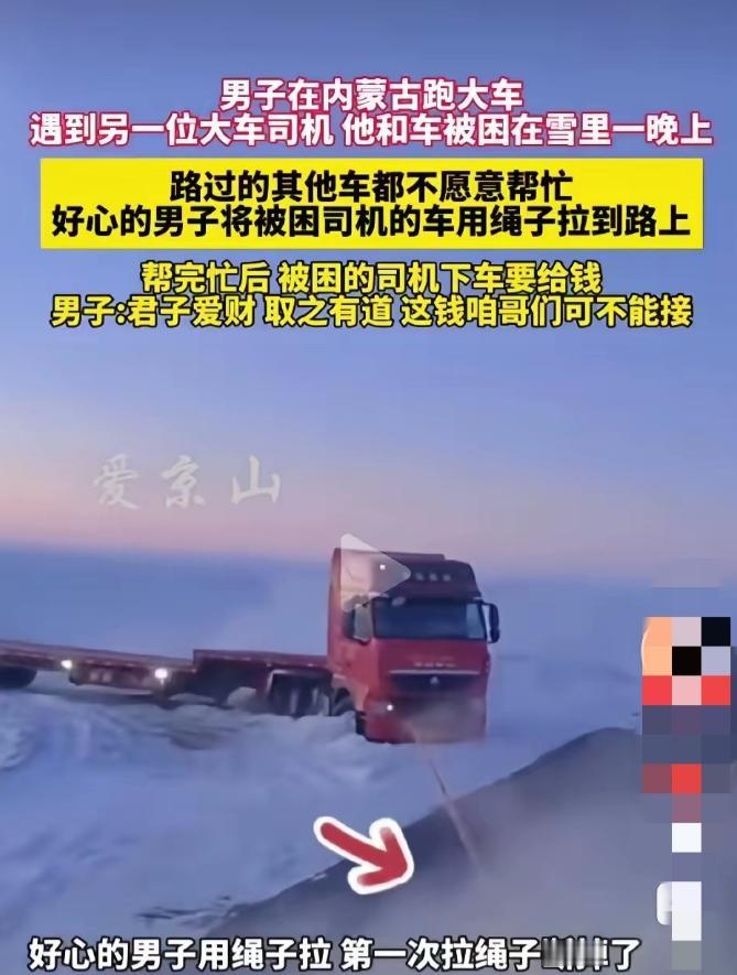 男子在内蒙古跑大车,半路上看到一部大货车困在雪地里,上前一问得知,该车司机和他的车子已经在雪地里困了一晚上了,当时的气温是零下20多度。   零下20℃的低温,在内蒙古空旷的国道上足以冻结一切,更别说一个被困在雪地里整整一夜的货车司机。   在这样的极寒环境里,每多待一分钟,危险就多一分,被困司机在此前并非没有向路过的人求助,只是所有的呼喊都石沉大海。   长时间的严寒侵蚀,让他的嘴唇失去了血色,说话时止不住地打颤,泛红的眼眶里,藏着的是对困境的无力和对生存的渴望。   他指着车轮下堆积的厚雪,说起昨夜后半夜突如其来的暴风雪,车子瞬间陷进雪窝,任凭怎么尝试都纹丝不动,即便裹着三件棉衣,刺骨的寒意还是钻透衣物,冻得他牙齿不停打颤。   对于常年跑大车的人来说,极端天气下被困国道绝非小事,油箱可能因低温结冰导致车辆彻底趴窝,刹车系统也可能受冻失灵,更致命的是,长时间暴露在严寒中极易引发冻伤,甚至威胁生命。   听完被困司机的遭遇,路过的这名男子没有丝毫迟疑,当即决定出手相助。   他转身返回自己的货车,取出拖车绳,动作娴熟地将两辆车的挂钩牢牢绑在一起。   一切准备就绪后,他启动车辆开始尝试拖拽,同时示意被困车辆挂低速挡配合供油,发动机的轰鸣在寂静的雪原上回荡,车轮碾过积雪,留下两道深深的印记。   遗憾的是,第一次拖拽并未成功,拖车绳甚至被直接拉断,男子立刻明白硬拉行不通,一旦操作失误,很可能导致两辆车都陷入雪窝,届时救援难度会更大。   他果断跳下车,踩着没过脚踝的积雪绕到被困货车后方,拿出铁锹一点点清理车轮周围凝结的硬冰,每一下动作都显得格外吃力。   清理完积雪和积冰后,他又从自己的车厢里翻出备用防滑链,蹲在雪地里仔细安装,十几分钟的忙碌过后,他的双手早已冻得通红僵硬。   做好充分准备后,男子重新调整拖拽角度,确保两辆车保持在同一直线上,随后再次启动车辆。   伴随着一声沉闷的声响,被困货车的车轮终于缓缓转动起来,一点点从雪窝里挣脱出来,朝着安全区域驶去。   脱困后的司机激动得热泪盈眶,车辆停稳后,他当即拿出一沓现金想要表达感谢,却被出手相助的男子笑着拒绝了。   这起发生在内蒙古雪原的互助事件,看似是跑大车群体间的寻常善举,却折射出当下社会最珍贵的温情。   如今我们总在讨论陌生人社会的距离感,似乎每个人都在为自己的生活奔波,鲜少顾及他人,甚至有人感叹人与人之间的共情正在逐渐消失。   但这起事件恰恰证明,善意从未缺席,只是常常藏在那些不经意的选择里。   我们或许可以理解此前路人的犹豫,极端天气下的救援本身就存在风险,担心自身受困、顾虑救援成本,这些都是现实的考量,不能简单将其归为冷漠。   但真正的善意,从来都不是权衡利弊后的理性选择,而是发自内心的共情与不忍,就像这位出手相助的男子,他深知跑大车的艰辛,更懂零下20℃寒夜被困的绝望,这份“同路人”的共情,让他毫不犹豫地伸出了援手。   要知道,全国千万名货车司机承载着全社会绝大部分的货运量,他们以车为家、与路为伴,每一辆穿梭在风雪中的货车,装着的不仅是货物,更是一个个家庭的生计与期盼。   对他们而言,路上的互助从来都不是简单的“搭把手”,而是绝境中的相互托举,是对“同是天涯沦落人”的深刻体悟。   那根在零下20℃严寒中紧绷的拖车绳,拉出来的不仅是一辆被困的货车,更是人与人之间的信任与温暖,打破了“陌生人社会”的冷漠标签。   在这个充满不确定性的时代,我们每个人都可能遭遇突如其来的困境,都可能需要陌生人的帮助。   这份在内蒙古雪原上传递的善意,更值得被当成一种社会共识传承下去,当更多人愿意在他人危难时停下脚步,哪怕只是微不足道的援手,都可能成为别人绝境逢生的希望。   善意的传递从来都不是单向的,唯有让温暖流转、让信任延续,才能抵御世间所有的寒凉。   大家对此怎么看?欢迎评论区留下您的观点!