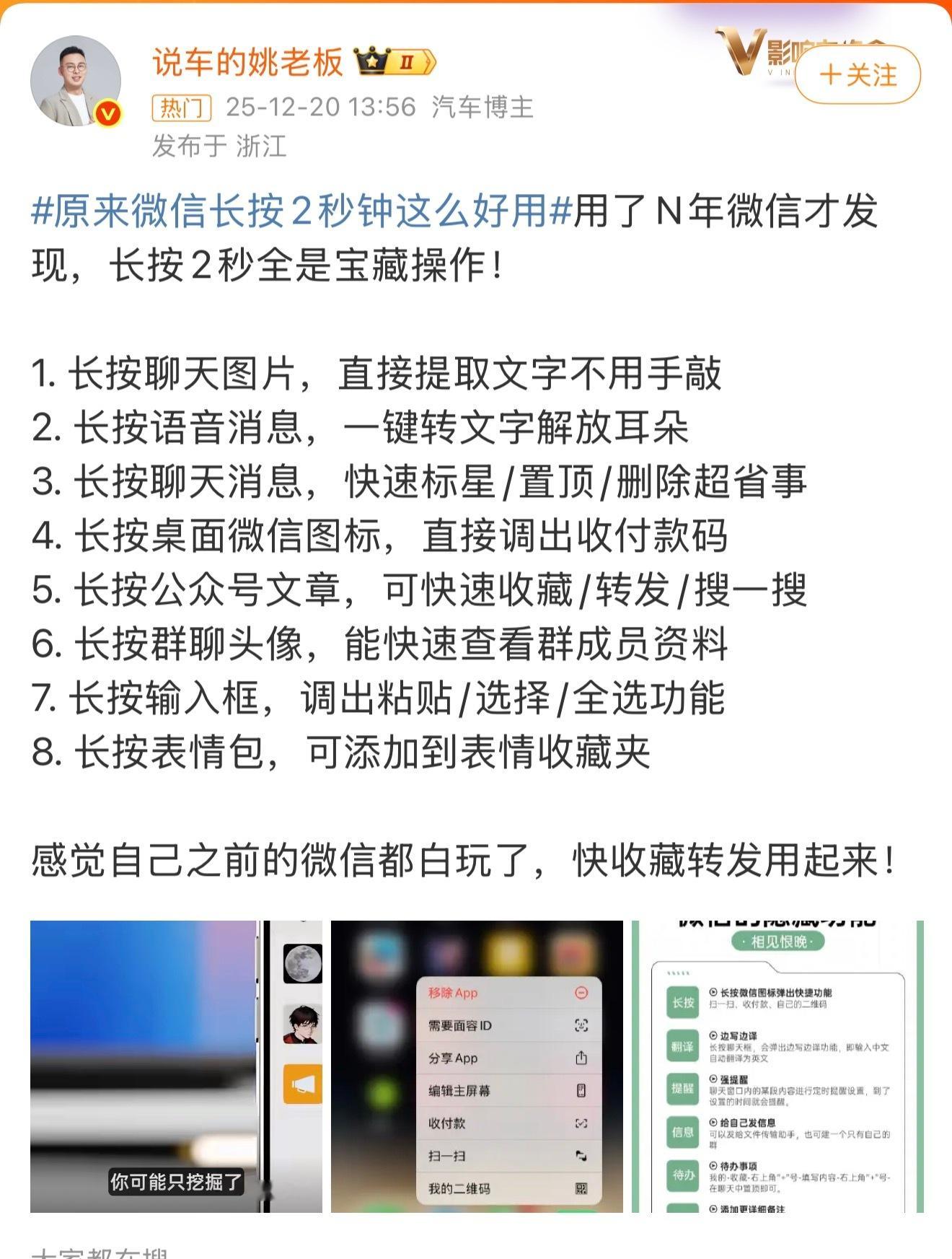 原来微信长按2秒钟这么好用都给大家汇总到这里了,直接看就行了,不过现在老感觉自己很懒很懒,就是已经习惯了一种固定的认知,不会去学这些新的东西,虽然很有用。就像这些功能,确实有用,但是我也不会去学,就是感觉自己用就行,宁愿瞎折腾,也不愿意去了解新功能。