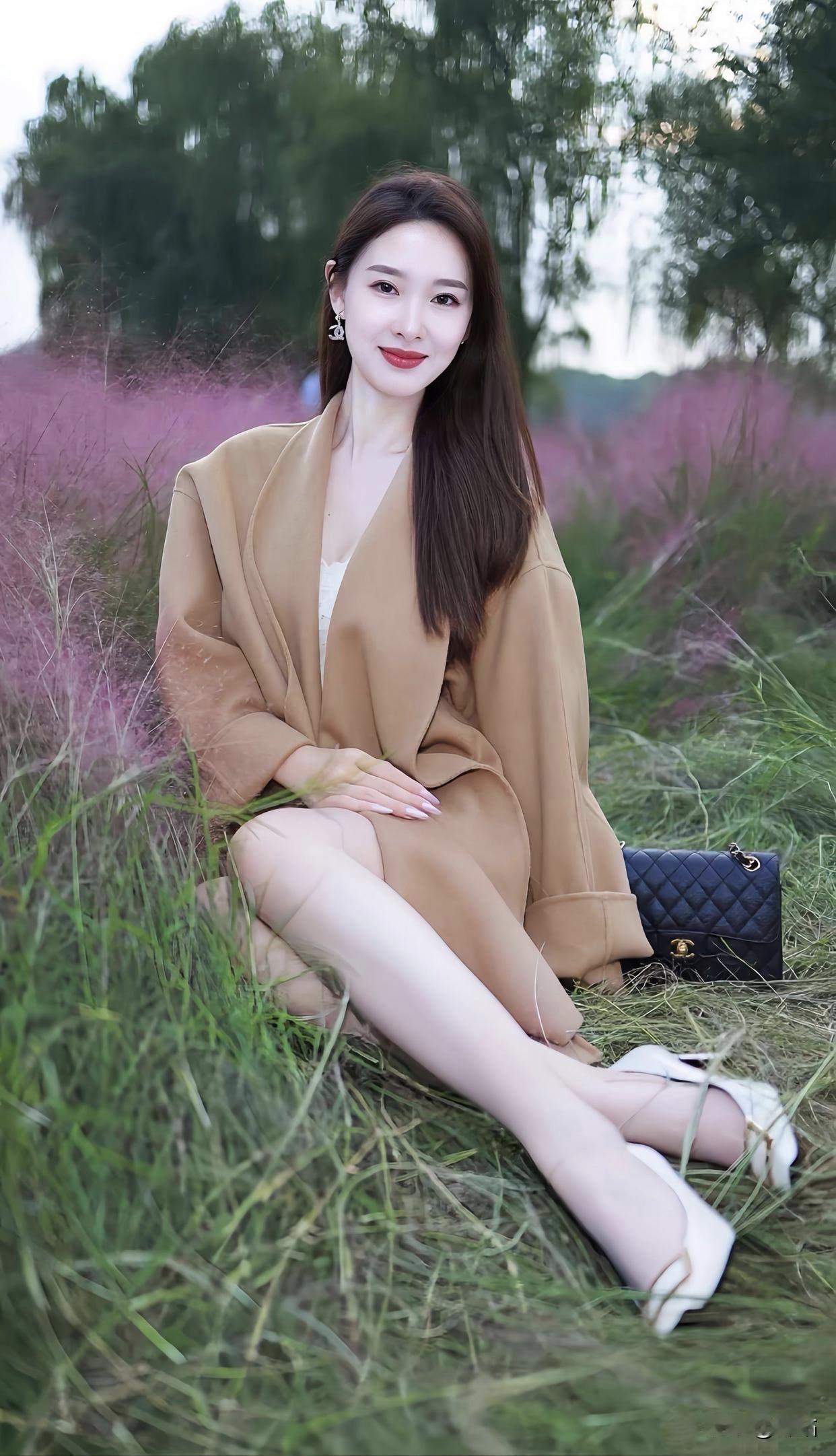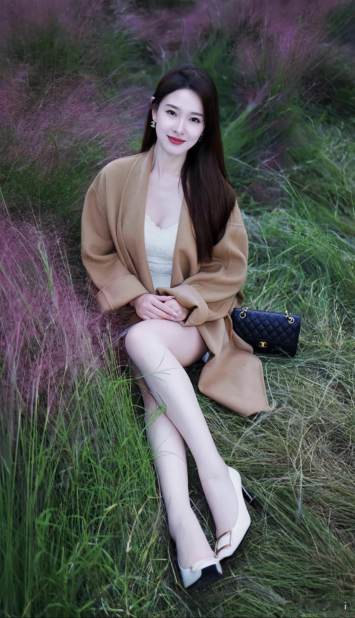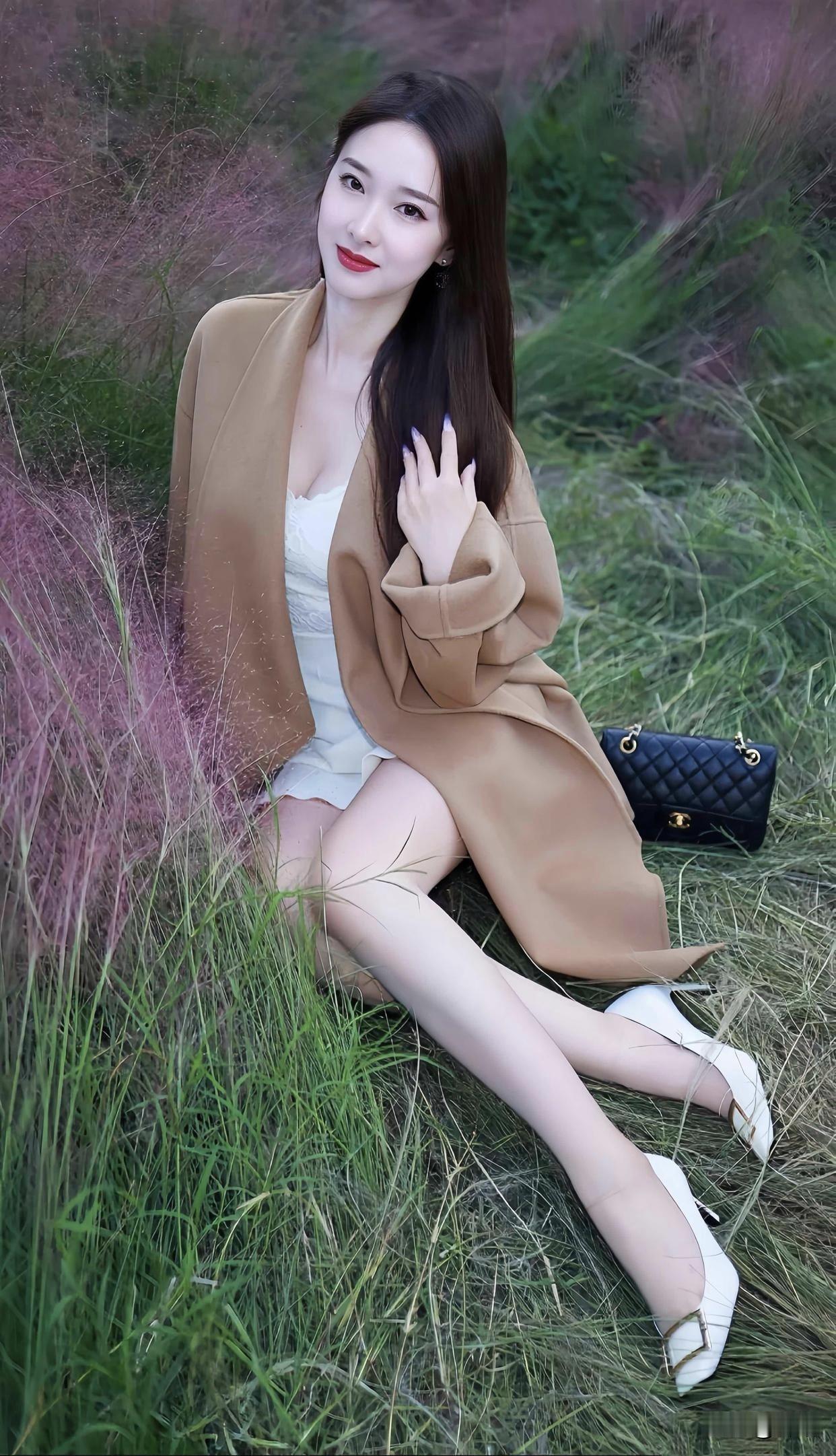 美图欣赏,看图写诗 《秋草映娇容》 秋郊草色醉胭红,浅坐芳丛意未穷。 笑靥轻扬风拂鬓,一川霞影落眉中。 《粉雾里的秋》 粉草揉碎了晚光, 风绕着发梢轻晃。 你身下是秋的软浪, 把温柔,漾成了诗行。 图片来源于网络