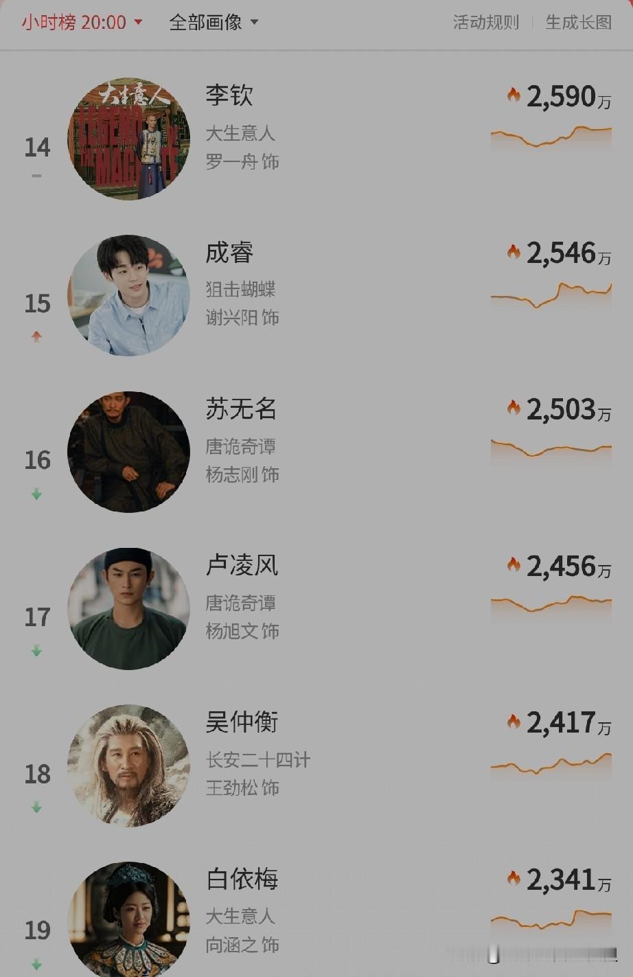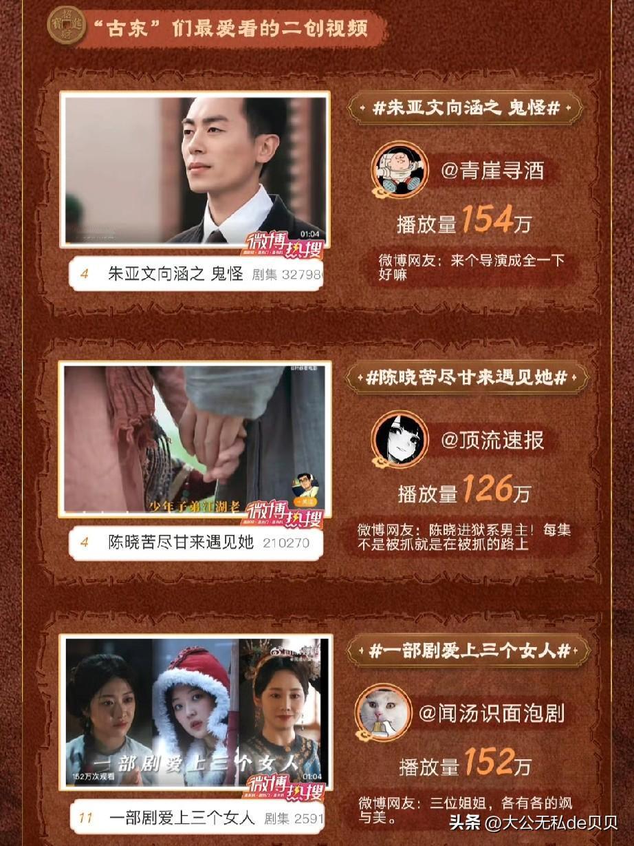 大生意人收官,从总结战报来看,陈晓饰演的第一男主古平原,应该是没达到播出预期。 微博角色榜,男二罗一舟位居第14,下面依次是向涵之,朱亚文,再下面才是陈晓。 陈晓甚至还不如任嘉伦那个剧的男配谭凯角色热度高。 而且李成白依梅都下线好久了,排名依旧在男主前面。 只能说男主的存在感真的太低了。 抖的热搜榜就更惨烈了,几乎被李成白依梅碾压。战报里唯一的百万赞视频,是李成白依梅的。 50万+的两个里,也有一个是他们。 现在陈晓的下一部古装大男主剧成绩如何了?这部明显是没达到预期!