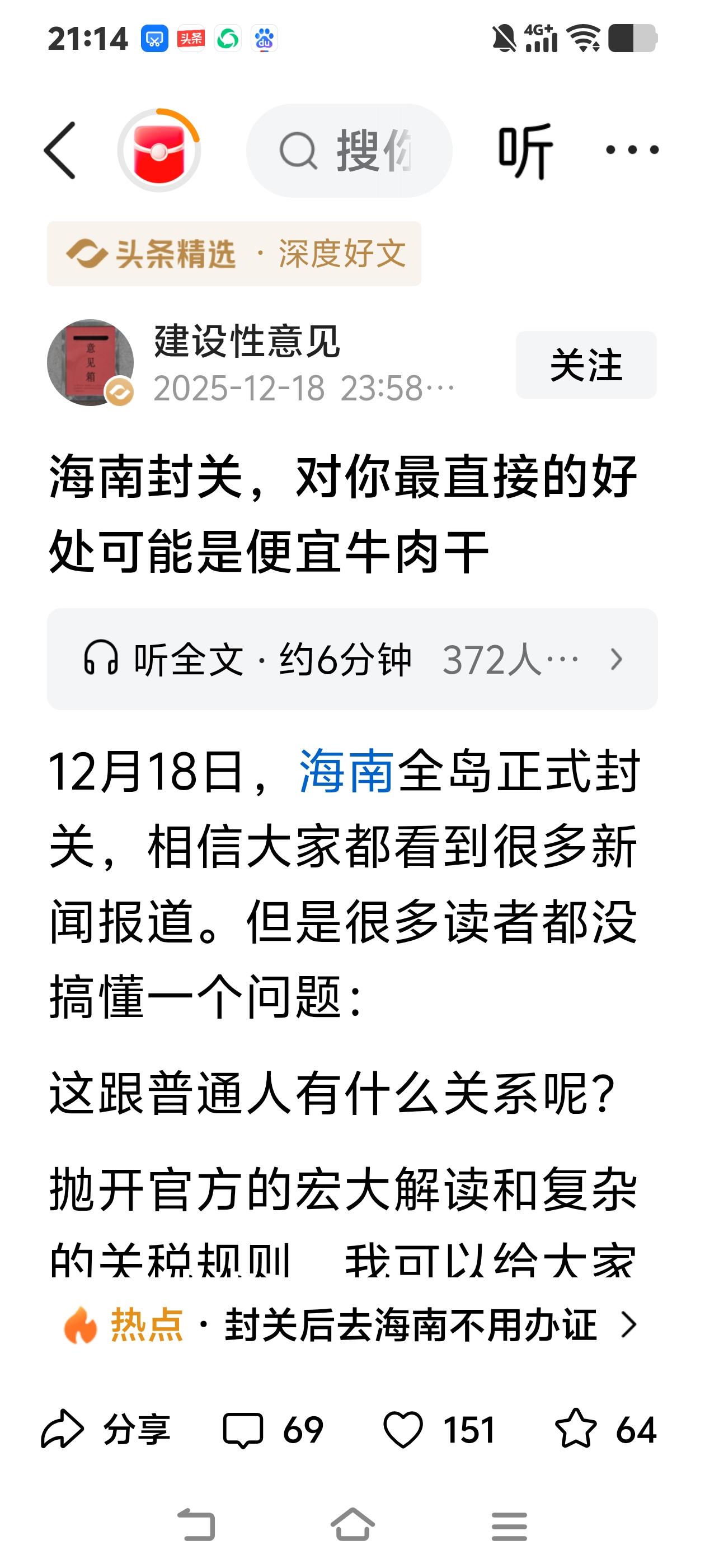 海南封关,对你最直接的好 处可能是便宜牛肉干,以后吃进口牛肉干再也不用心疼钱包啦! 先跟大家说清楚,封关不是封岛,反而像是给海南开了个全球好物直通车,现在海南“零关税”商品直接扩到6600个税目,覆盖了74%的商品,连进口食品都被重点纳入其中 ,不管是澳洲的优质牛肉、蒙古的风干腱子,运到海南加工增值后,就能享受关税减免,最后卖到咱们手里的价格自然往下压! 之前买一包进口牛肉干动辄五六十,封关后靠着“零关税+加工增值”的双重buff,商家成本降了,零售价大概率能便宜不少,实现“追剧嚼肉干自由”不是梦 ,而且不止牛肉干,以后泰国榴莲、挪威三文鱼这些进口美食,都能跟着沾光降价,咱们在家门口就能吃到性价比超高的全球风味。精选铁粉点评计划 更方便的是,不管你是去海南旅游,还是在网上下单,都能轻松买到这些实惠好物。现在86个国家免签入境海南,航线也越来越密,去海南逛吃顺便囤点牛肉干,就跟周末逛街一样方便 ,岛内居民更划算,一年离岛一次,就能不限次数买15类免税好物,牛肉干肯定在列 ! 海南封关带来的红利,早就从政策文件落到了咱们的零食袋里,以后想吃高品质牛肉干,不用等代购、不用看汇率,花更少的钱就能吃到原汁原味的进口货,要不要现在就计划下,去海南逛免税店囤一波便宜牛肉干呀?