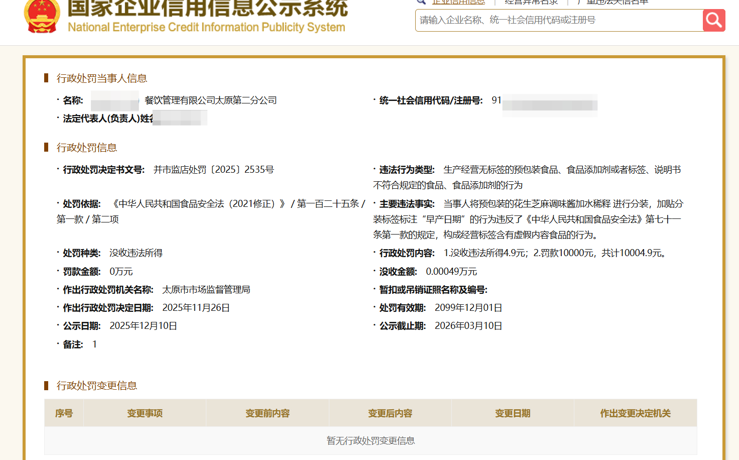 #市监部门回应买到6天后调味酱#【外卖买到“6天后的调味酱” 消费者曾因免罚决定起诉 市监部门已处理:罚款一万元】#餐饮店卖6天后调味酱被罚一万# 今年6月9日,家住山西太原市的陈女士在某连锁餐饮店下单外卖,收到的花生芝麻调味酱标注的生产日期却是6月15日。陈女士选择对涉嫌虚假标注生产日期的门店进行投诉,太原市小店区市场监督管理局对于商家的行为作出“免罚决定”,此事引发多家媒体报道关注。今年12月10日,小店区市监局营盘市场监督管理所工作人员在红星新闻记者采访时则表示,该事件由太原市市场监督管理局作出了行政处罚,并非免罚,具体处罚结果可关注国家企业信用信息公示系统。日前,红星新闻记者查询到该处罚决定:因生产经营无标签的预包装食品、食品添加剂或者标签、说明书不符合规定的食品、食品添加剂的行为,涉事门店所属公司被没收违法所得4.9元,罚款10000元。对此处罚,餐饮公司工作人员表示暂不回应。网页链接