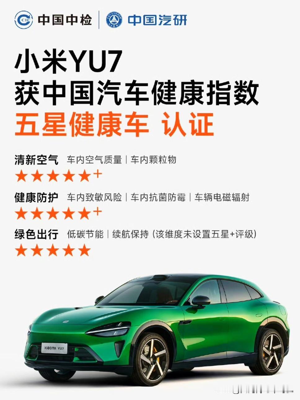 恭喜小米YU7获“五星健康车”称号 。 该认证由中国中检及中国汽研权威评测,车辆在“清新空气”与“健康防护”维度均获五星+最高评价。 彰显其在车内空气质量、颗粒物过滤、致敏风险控制及电磁辐射安全等方面的卓越表现。 同时,YU7在绿色出行方面亦满足低碳节能与续航保持要求,全面引领健康出行新标准。