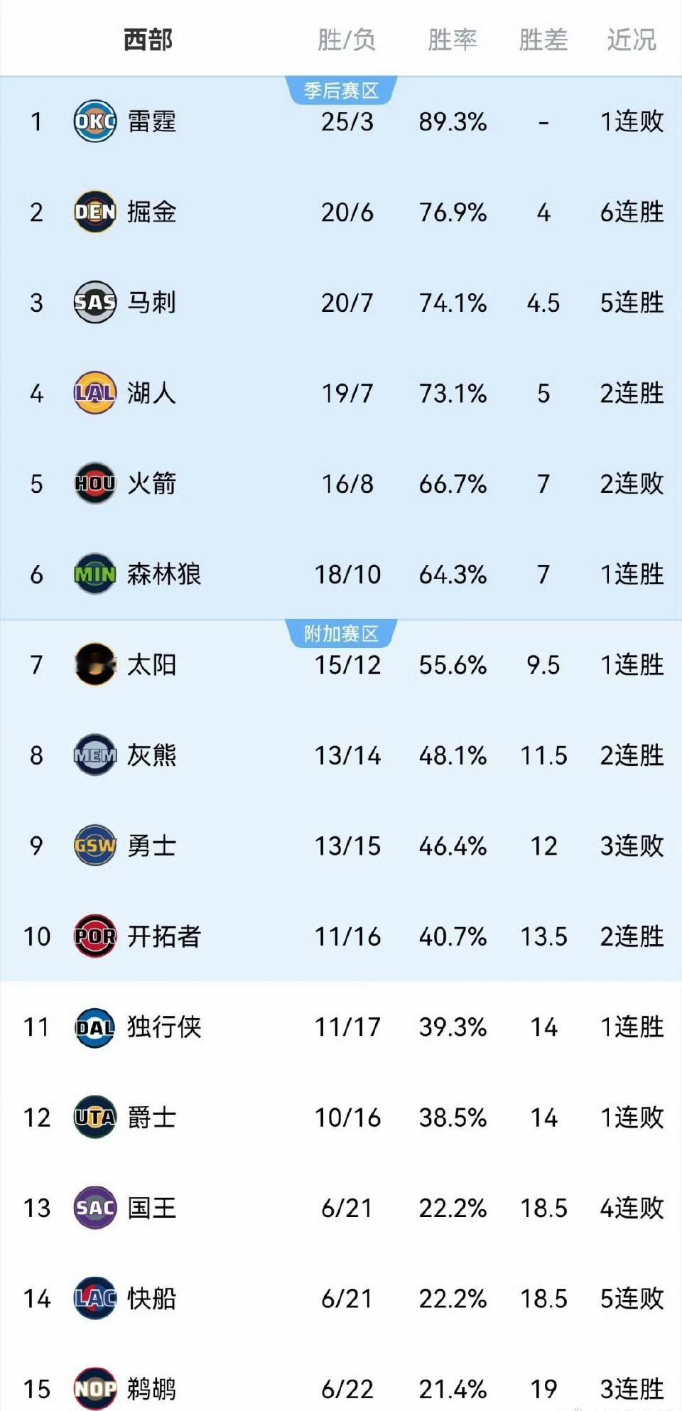 雷霆再添一败,虽然它依然稳居榜首,但要想超越勇士当年的73胜9负常规赛纪录,难度还是挺大的。 马刺大胜老鹰,排名反超湖人升至第三,湖人跌至第四。 森林狼赢球依然保持第六,但拉开了与第7的差距。