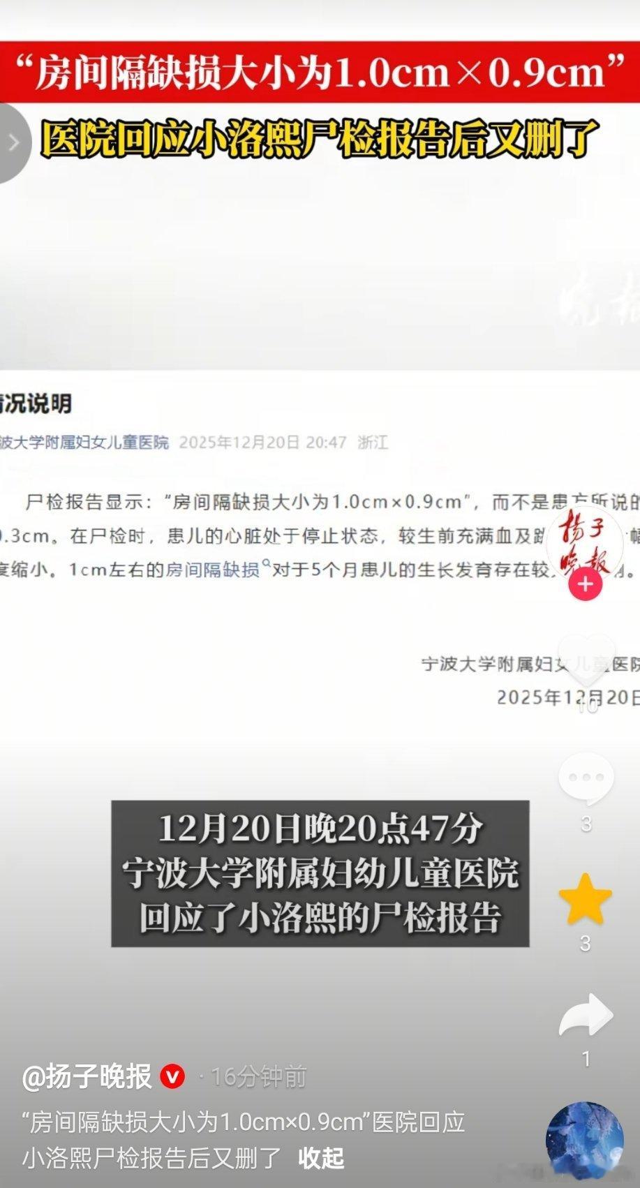 我现在最关心的不是医院删除回应。而是本次事件最关键的摄像头监控回放问题。能不能公布小洛熙的手术全过程,打消公众质疑?医院删除小洛熙尸检报告回应