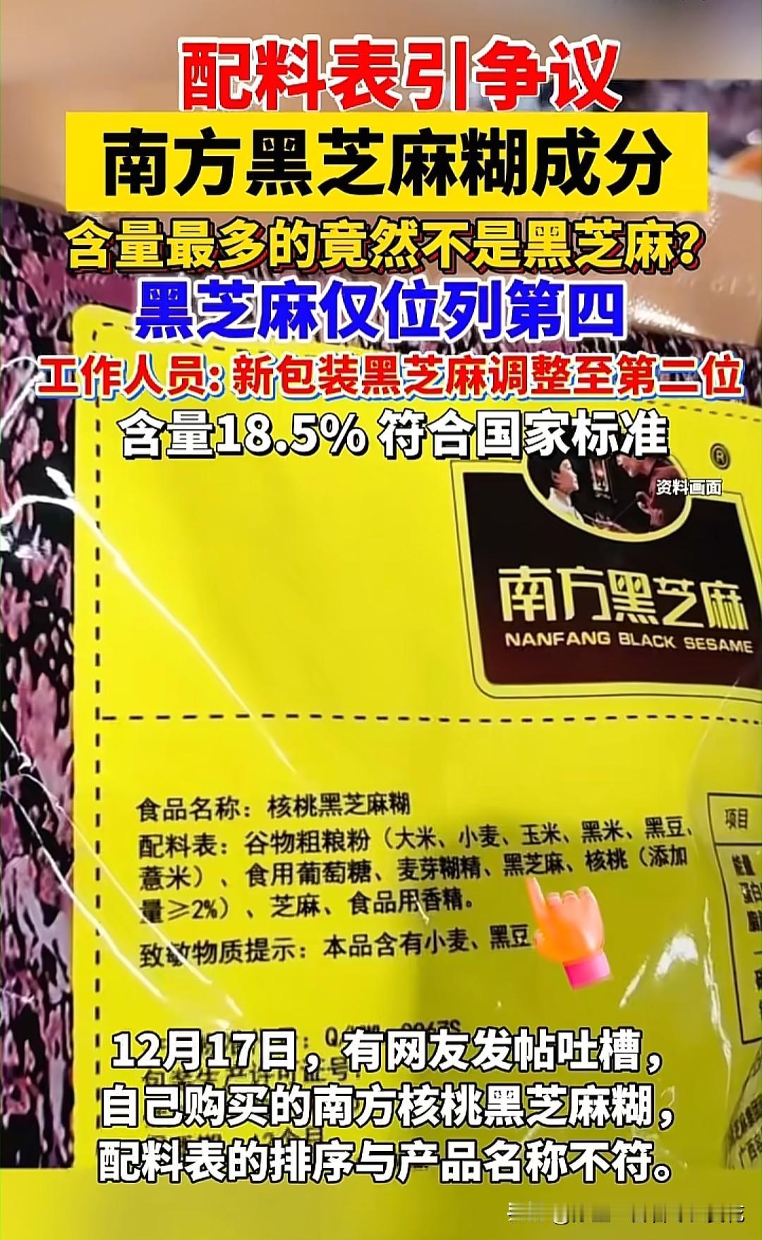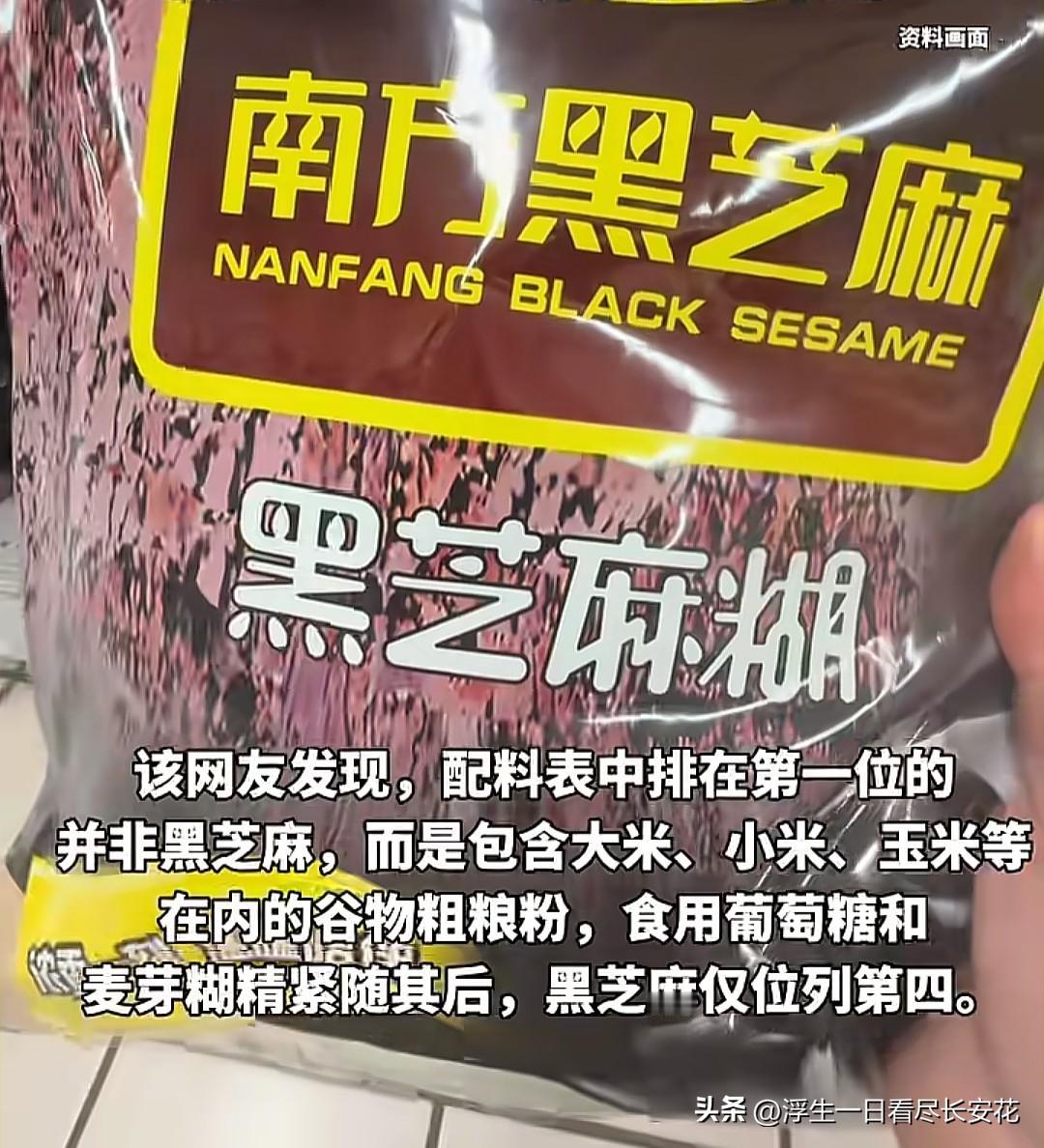 原来南方黑芝麻糊含量最高的不是黑芝麻,有多少人被这个骗到了呢?南方黑芝麻糊最大的卖点就是很多消费者会误以为自己吃的是黑芝麻,而且也是唯一能把黑芝麻做的很好吃的食品。万万没想到的是,自己吃的依然还是米糊。 除了南方黑芝麻糊,红烧牛肉方便面也是同样的套路,在国内能标“红烧牛肉面”,但是出口了就只能写“红烧牛肉味”。因为出口要求严,有就就是有,没有就是没有,哪怕含量低也不能标的起眼,甚至忽略不计。相反国内就没那么高得要求,甚至还可以注册成商标,即便没有黑芝麻,它也能叫黑芝麻。 如果我们在选购商品的时候,先看配料表,如果图片仅供参考,就要慎重了。