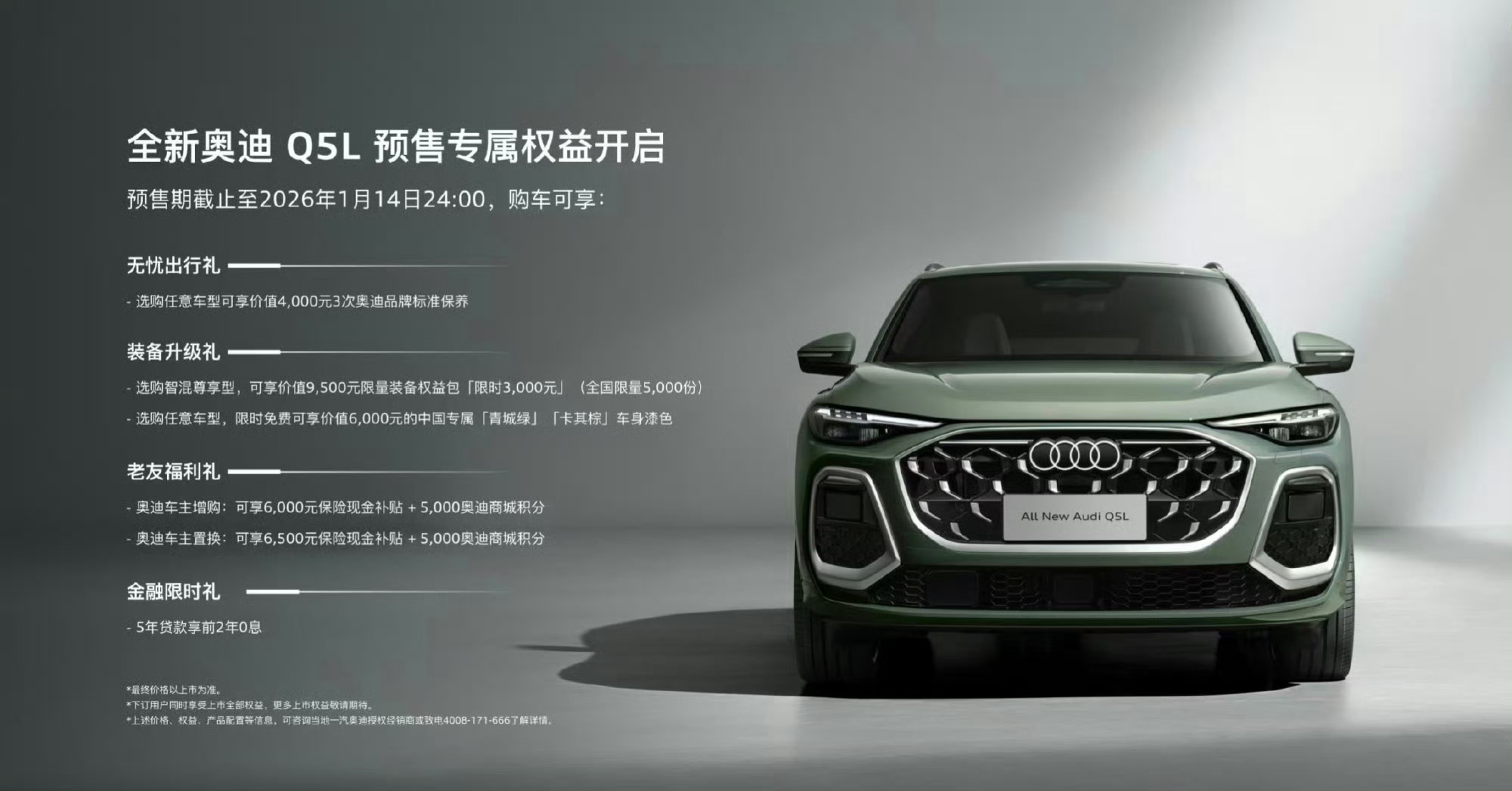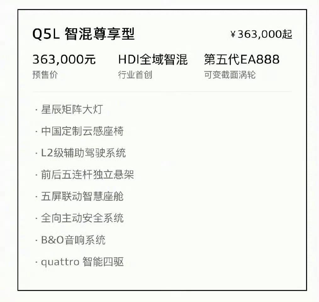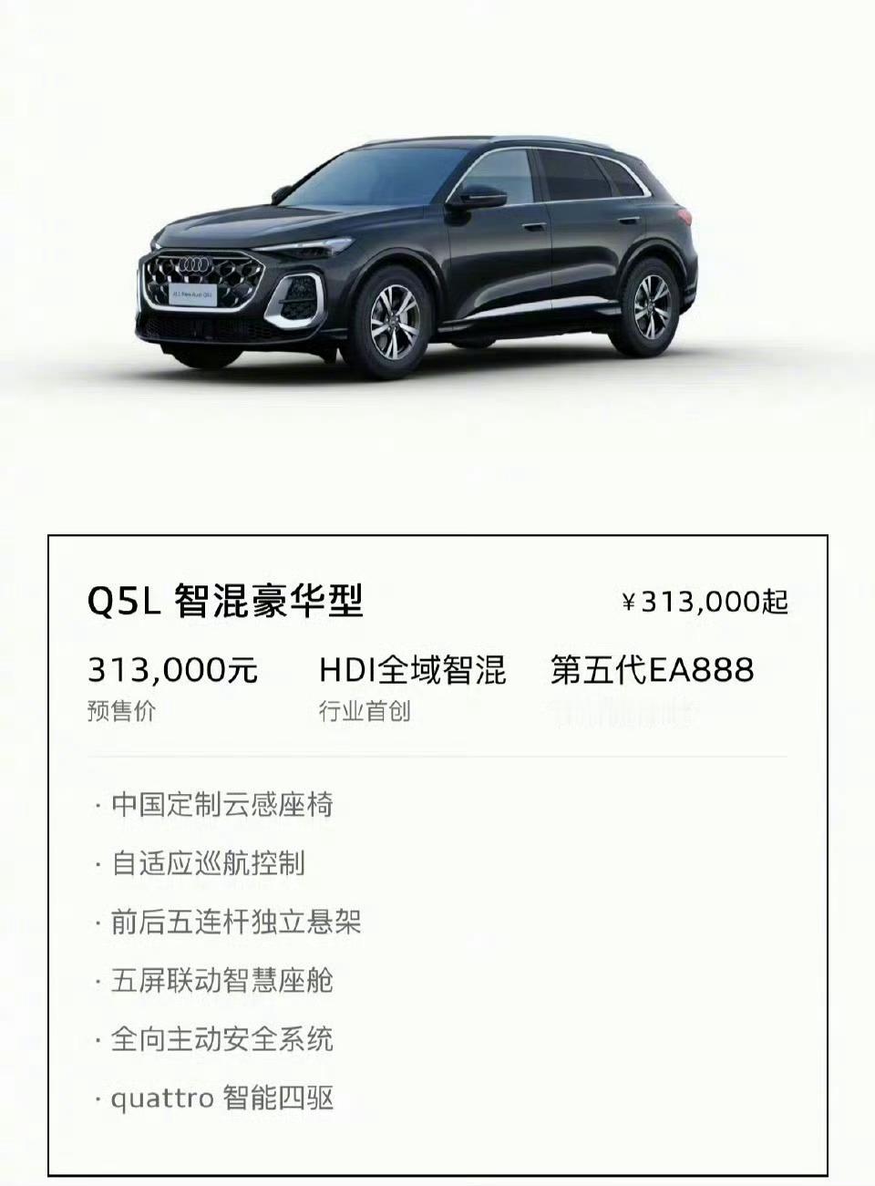 全新奥迪Q5L开启预售,售价31.3万-38.5万元共四款车型。新车搭载HDI全域智混系统与第五代EA888发动机,全系标配quattro智能四驱,高配车型搭载华为乾崑辅助驾驶系统,部分版本有专属外观升级或B&O音响等配置。这价怎么样?