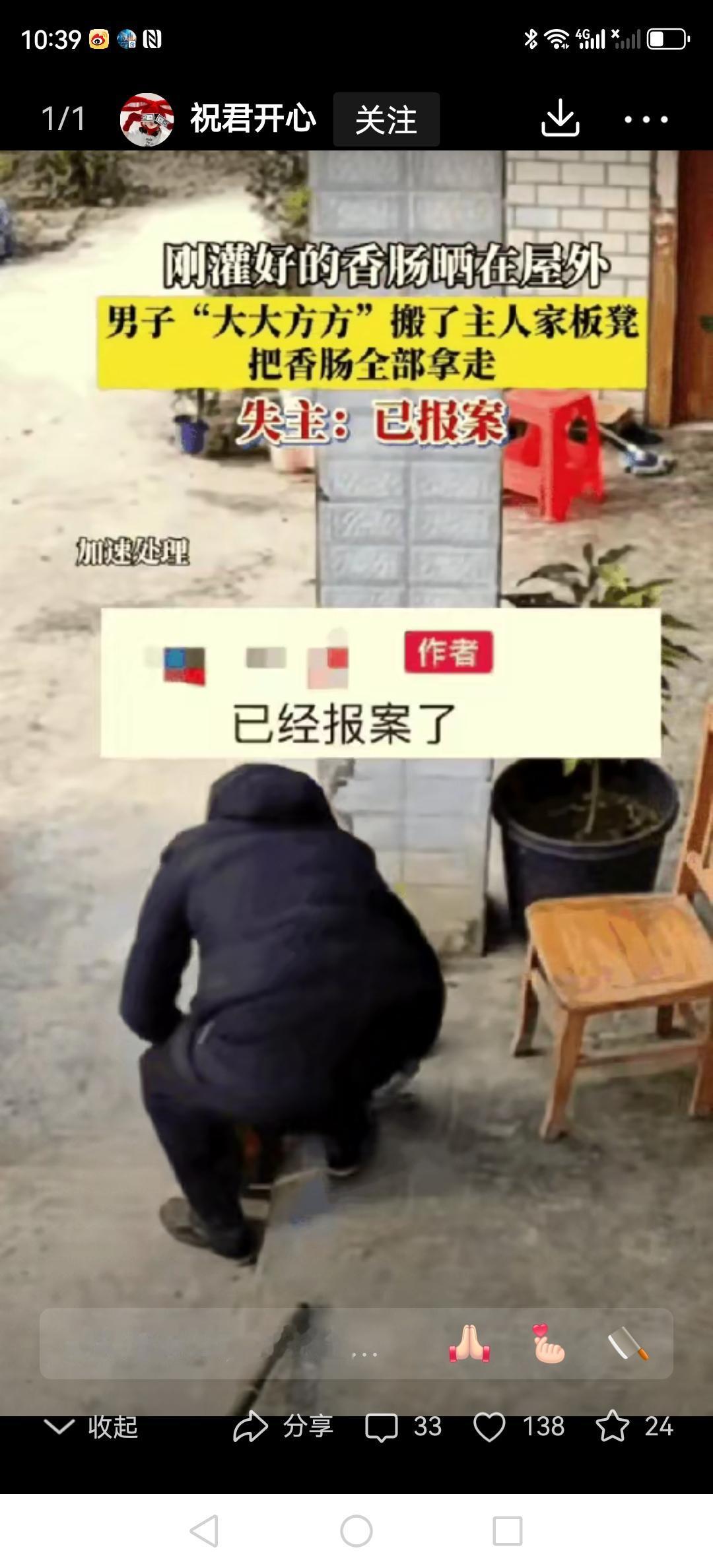 香肠大盗现形记!成都一女子刚灌制好的香肠晾在自家门口屋檐下,还不到一天的功夫,就被人偷得一干二净。监控画面记录下让人来气的一幕:一名男子嘴里叼着烟卷,旁若无人地卸下晾晒用的木杆,把一整排香肠都顺手牵羊拿走了。 这哪里是偷几根香肠啊,这简直是偷走了人家的心意和辛苦!让人更来气的是,这小偷穿得整整齐齐的,看着根本不像是缺吃少穿的人。现在市场上猪肉也就11块钱一斤,就为这点小便宜,做出这种丢脸的事,真不值当啊! 网友们都气坏了:“这小偷手法挺熟练的,估计是个惯偷!”“必须赶紧报警好好治治他,让他明白偷东西是要付出代价的!”香肠虽少,但这事儿暴露的却是社会公德的大问题啊。 快过年了,小偷小摸的事儿又多了起来。提醒大伙儿把年货都看紧点,别让那些“香肠大盗”有机会下手。你家年货都收好了吗?遇到过这种糟心事没? -search.byteimg.com/img/labis/c872f094366ca6bf71a6471ce1a3d8e2~480x480.JPEG香肠 晾香肠 麻辣香肠腊肠 晾肉香肠 香肠晾晒 成都香肠腊肉 四川幺妹香肠