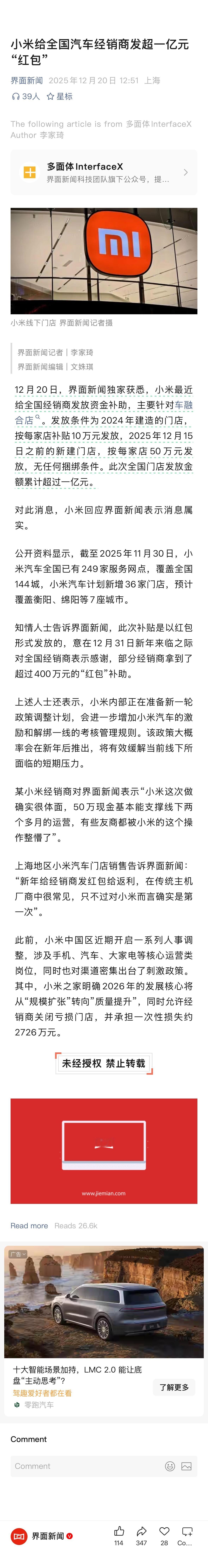小米!牛逼!看到这个消息真的被暖到了!累计超过一个亿的补贴,而且是无任何捆绑条件的“红包”这在现在的汽车圈里简直是清流中的清流!有些店甚至能拿到400万,这哪是补贴啊,这是直接给经销商打了一剂强心针!之前还有小黑子在那酸小米调整门店损失,现在看清楚了吧?这叫合理的结构性调整,承担该承担的损失,发放该发放的奖励,这才是一个顶级企业该有的格局和担当! 小米