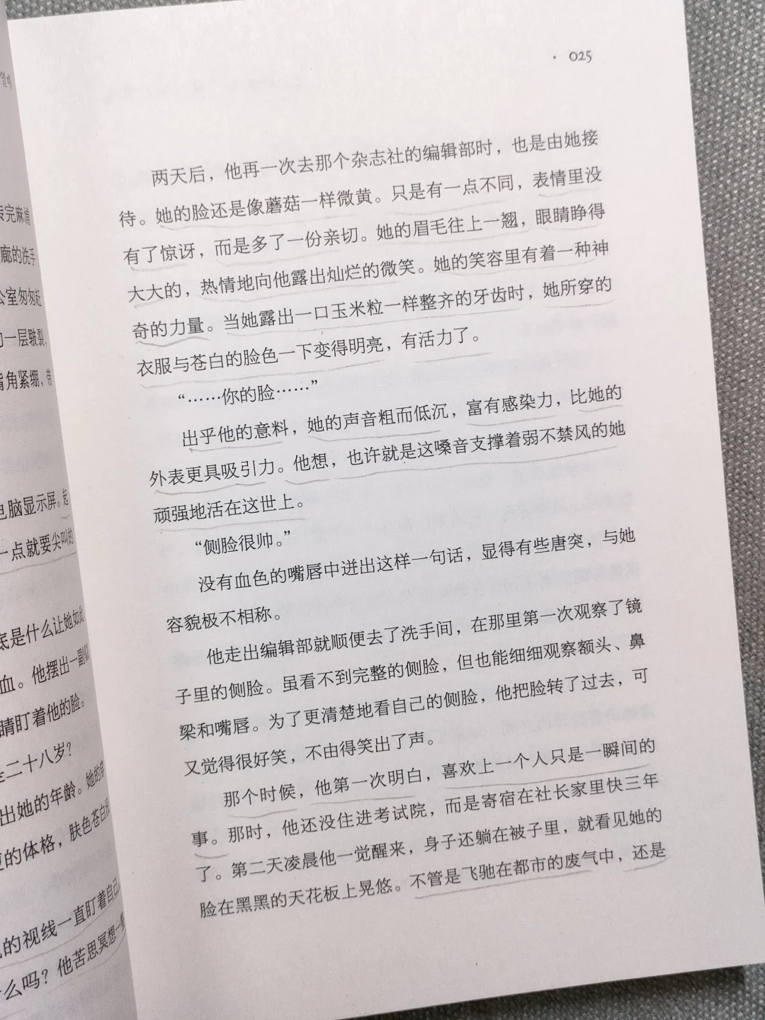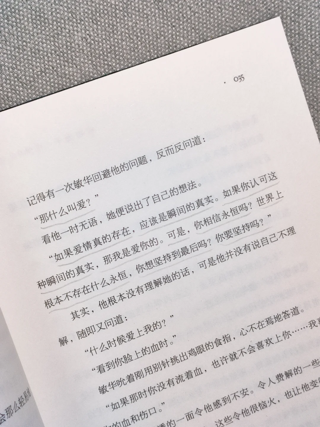 🥀主人公在配书的过程中认识了敏华,初见时她一脸惊愕,因他的脸流血,“是皲裂的地方终于完全裂开,流出了血”,她说“侧脸很帅”,喜欢上了他。他们快速坠入爱河,但不久后两人之间的爱情出现裂痕,吵架、冷战、动手,到她背叛了他。他心中燃烧起愤怒与杀意,进而“如野兽般”辗转反侧,结果用刀捅了她的大腿。