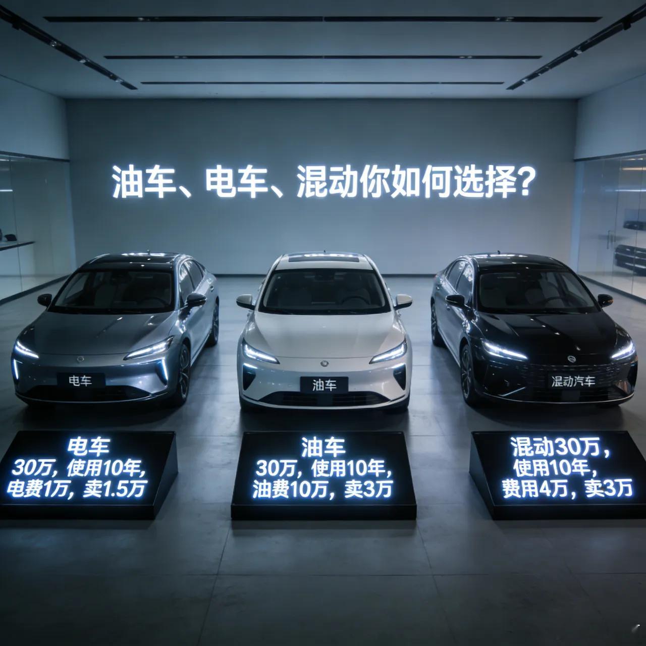 被难住了!油车、纯电车、油电混动,到底买哪种车才好?曾经无脑燃油车的时代,现在变成了买油车还是买电车,又有说电车跑不远,不如买增程。电车30万,使用10年,电费1万,卖1.5万。油车30万,使用10年,油费10万,卖3万。混动30万,使用10年,费用4万,卖3万。油车、电车、混动你如何选择?
