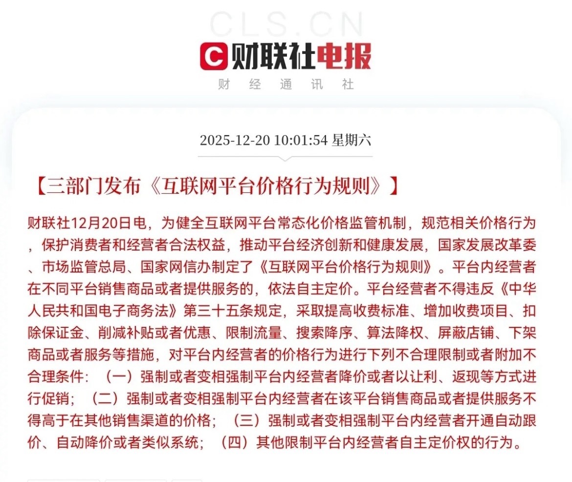 重大利好!三部门联合发布!下周平台经济概念估计要一飞冲天了!周六上午10点01分,财联社消息,为健全互联网平台常态化价格监管机制,规范相关价格行为,保护消费者和经营者合法权益,推动平台经济创新和健康发展,三部门联合发布了《互联网平台价格行为规则》,平台经济迎来重大利好政策,大消费板块迎来大利好新规的发布并非意在打压平台经济,而是通过立规矩来促发展,目的就是引导市场从无序的价格战转向有序的价值战,这将有利于互联网平台良性发展,是大利好政策,对于消费者而言,能减少甚至杜绝消费陷阱,如大数据杀熟,捆绑销售,自动续费扣款等消费困扰,让消费者买的放心,买的称心,对于平台上的商家也是大利好,这是三赢的好规则!股民们!平台经济迎来重大利好新规,坐稳扶好!预计下周平台经济,以及部分消费行业的核心公司要起飞了!