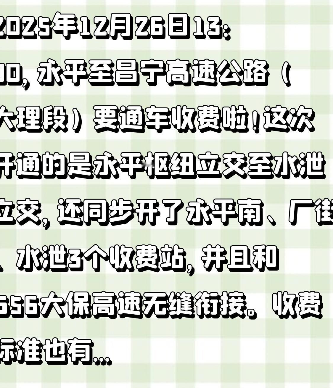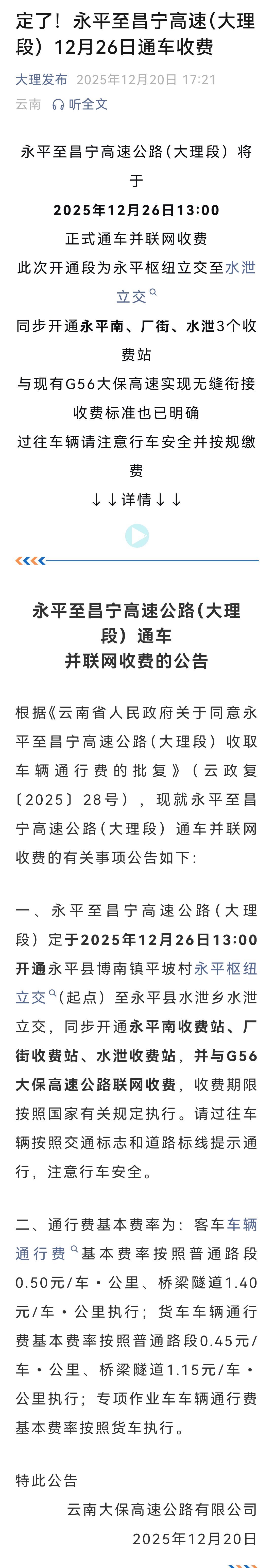 2025年12月26日13:00,永平至昌宁高速公路(大理段)要通车收费啦!这次开通的是永平枢纽立交至水泄立交,还同步开了永平南、厂街、水泄3个收费站,并且和G56大保高速无缝衔接。 收费标准也有了,客车普通路段0.5元/车•公里、桥梁隧道1.4元/车•公里;货车普通路段0.45元/车•公里、桥梁隧道1.15元/车•公里。这条高速可是云南交通重点项目,通车后能缩短永平县内通行时间,加强大理和保山交通联系,对滇西旅游开发也有好处,以后出行更方便咯! 大理高速公路 永平县高速 永平收费站 昌宁收费站 高速公路 通车 对于经常往返于永平与昌宁之间的居民来说,这无疑是个天大的喜讯。以往,大家出行要绕不少弯路,时间成本很高。如今高速通车,就像是给出行装上了“加速器”。 想象一下,驾车行驶在崭新的高速路上,窗外是云南壮丽的山水风光。永平的深厚历史文化和保山的独特民俗风情,因为这条高速的连接变得触手可及。 对于旅游爱好者而言,滇西众多美景将更好串联起来。游客们可以更便捷地穿梭于各个景点之间,感受大理的风花雪月与保山的自然生态之美。而对于当地的经济发展,这条高速也将起到积极的推动作用。农产品能更快速地运输出去,吸引更多投资和游客,带动沿线地区的繁荣。相信在不久的将来,这条高速会成为滇西地区的一条“黄金通道”。